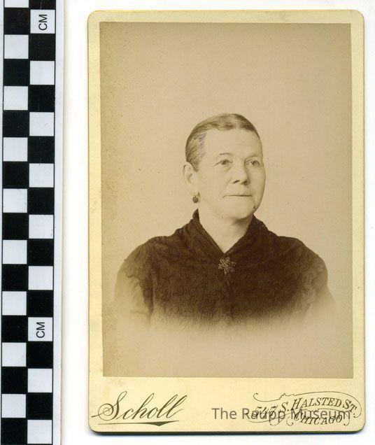 Black and white semi-glossy professional print mounted to a tan card. Studio information printed on the card below image. Portrait image of Kunigunda Metz. She is wearing a dark embroidered shirt and star brooch. reverse side has studio logo information and inscription: "Mrs. Kunigunda Metz; Grandma Raupp's friend."Dimensions