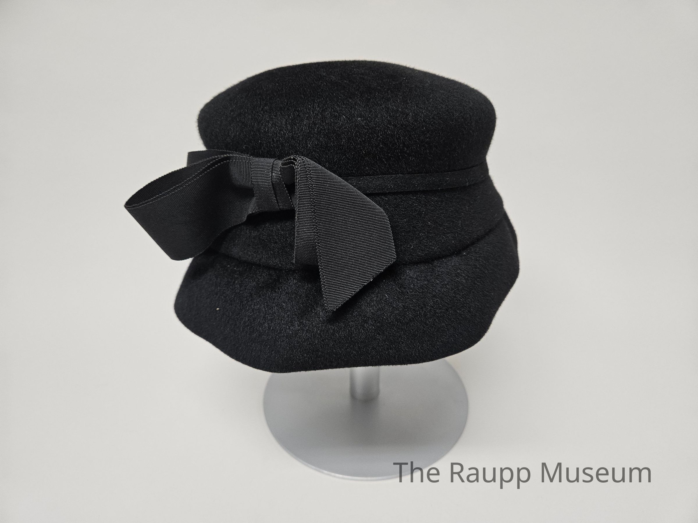 One (1) round black wool hat with gros-grain black ribbon bow in front. "100% Woll", "Henry Pollack Inc New York" printed on inside in white surrounded by crown decal and decoration surrounding type. Has rounded top and flat rim sticking out slightly. Size 22.Dimensions