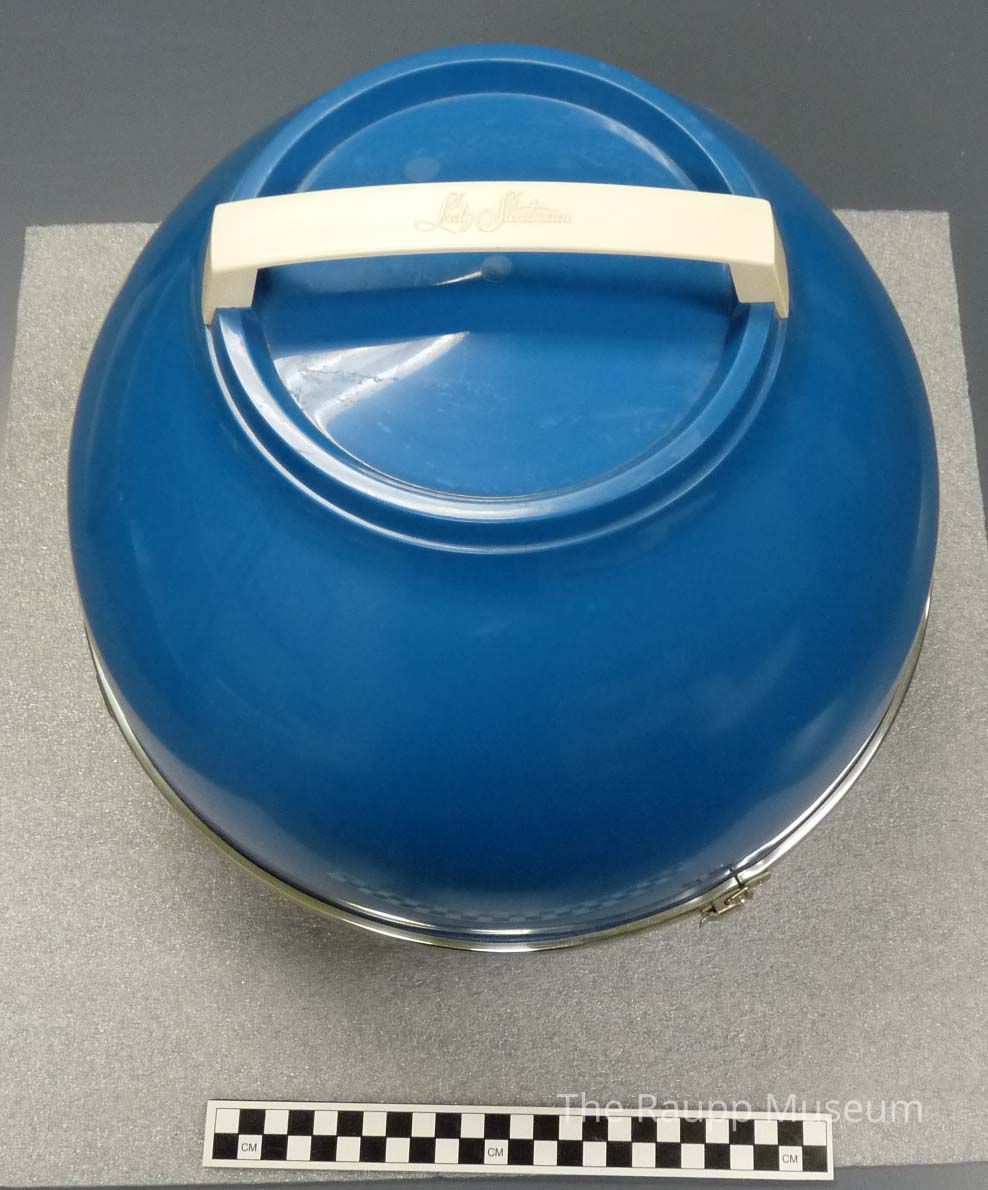One (1) Lady Sunbeam portable hair dryer. The hair dryer is blue and white. It opens up and rotates in order to fit over a head, has a white neck that attached to body of dryer and controls. Controls feature a dial to control amount of heat. The outside has "Lady Sunbeam" engraved on the top handle in white. Most of the exterior is blue with a white band along the center. There is a metal band along the center and two metal clasps to hold the top on. The inside top has small holes throughout. The bottom piece with controls has "Temperature, Off, Cool, Low, Medium, High" in silver writing. The white electric cord is attached to the inside bottom piece. There is a warning along one edge that states: "Caution Do Not Use Dryer While Bathing". There is a slatted piece near the center.