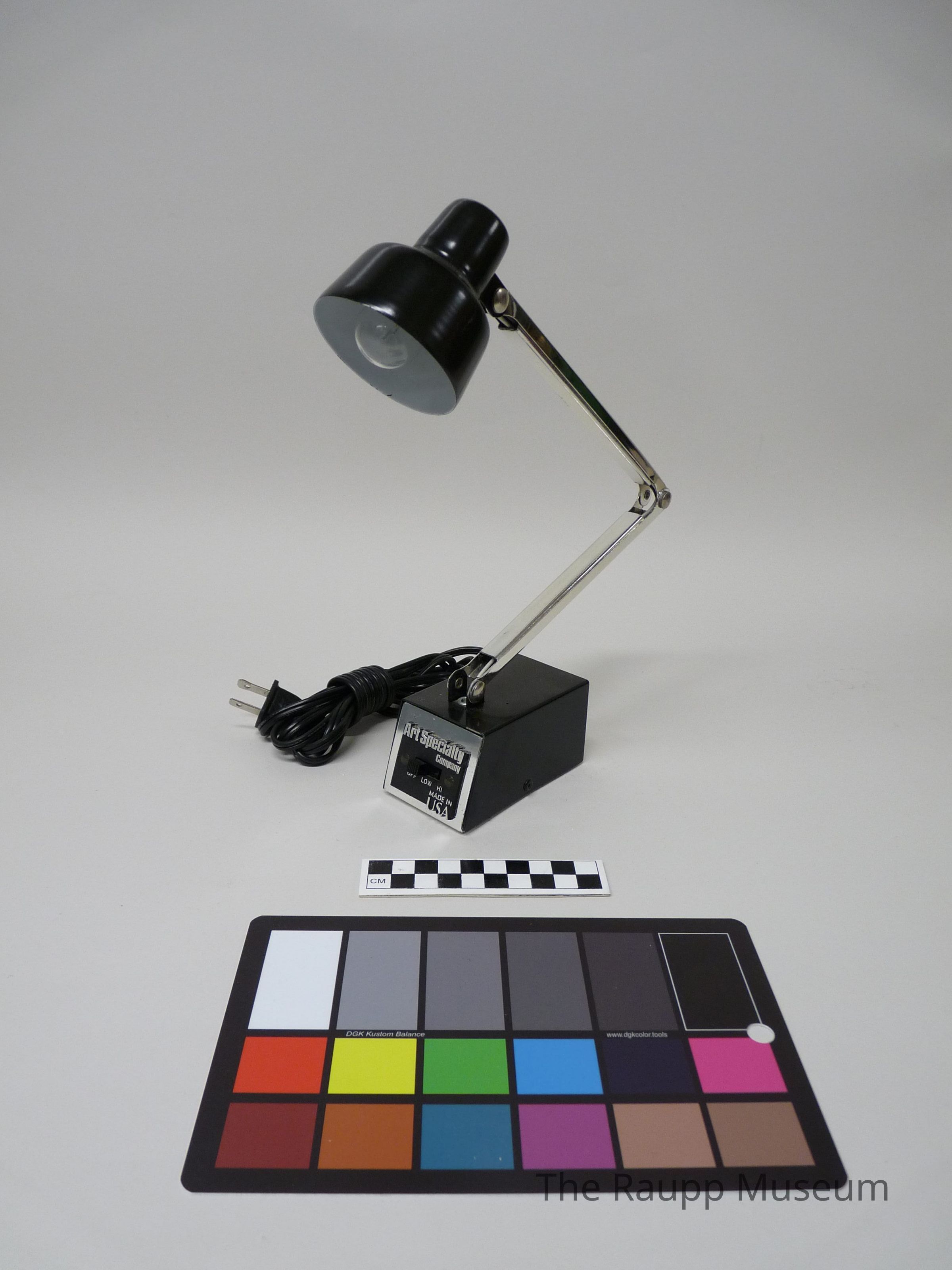 Lamp is primarily metal with a rubber cord. Base is black on the edges and silver and black on the front. There is the Art Specialty Company logo with "Made in USA" on the bottom right. In the center is a black plastic knob that has "off - low - high" settings. The arm is in two parts, with a bend in the center. The arm is silver metal. The lamp has black exterior and white interior, with wide at opening and smaller cone on back (half size of front opening). There is a small bulb in the lamp. There is a black cord.