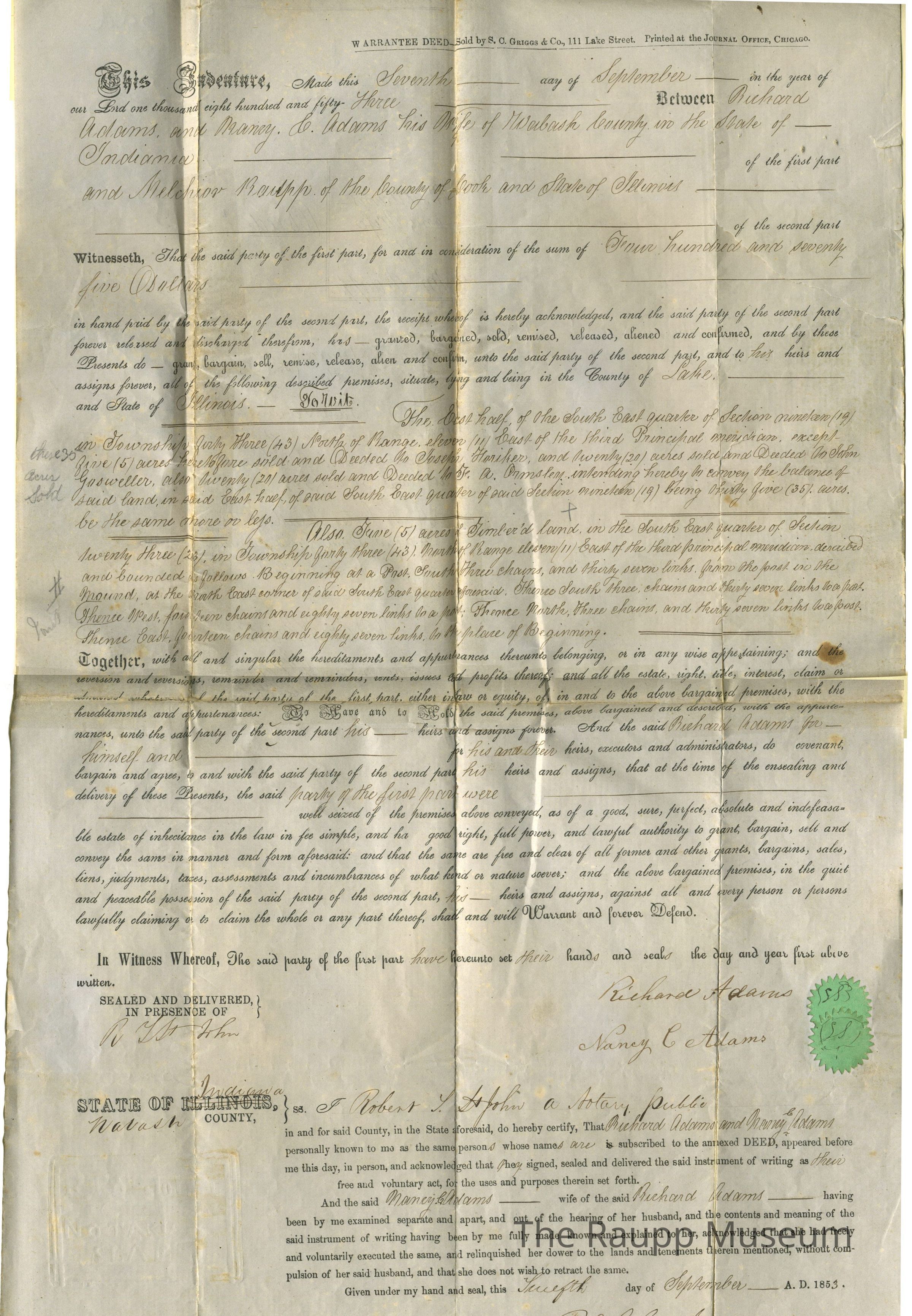 Signed by sellers Nancy and Richard Adams, buyer Melchior Raupp and notary public Robert L St John. reverse side has ink text.Archive Details