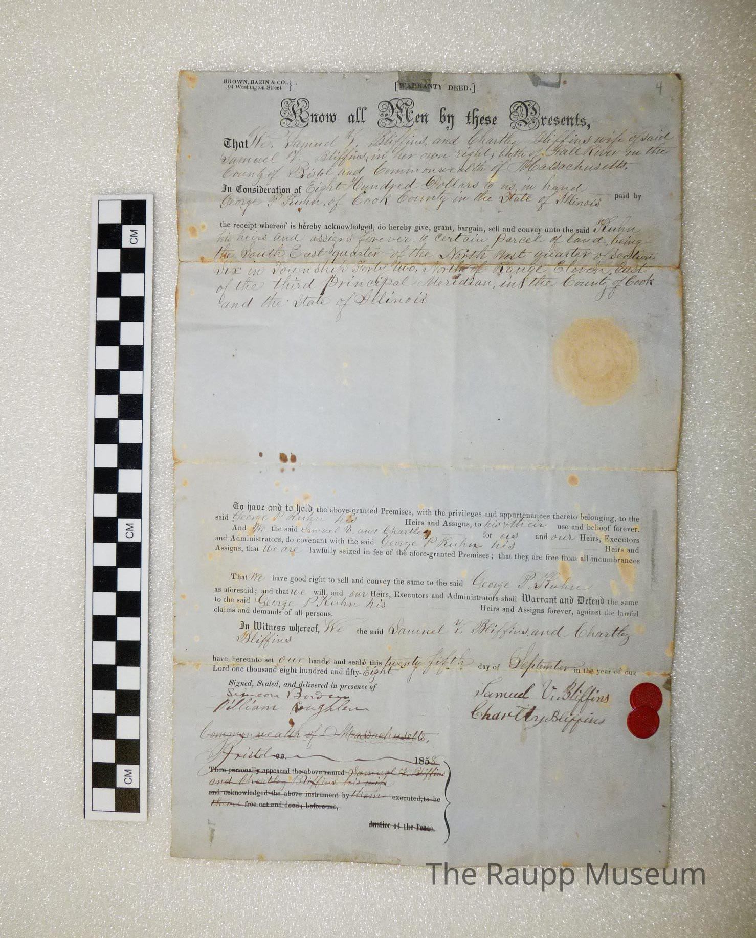 One (1) Land Deed. Sept. 25th, 1858. Falls River, Bristol County, Mass., George Kuhn bought 85 acres from Samuel Biffins, Johann Nickol purchased this land in 1861 for $2050.00, blue, quarter folded, 12" x 8", two red seals on front.Archive Details