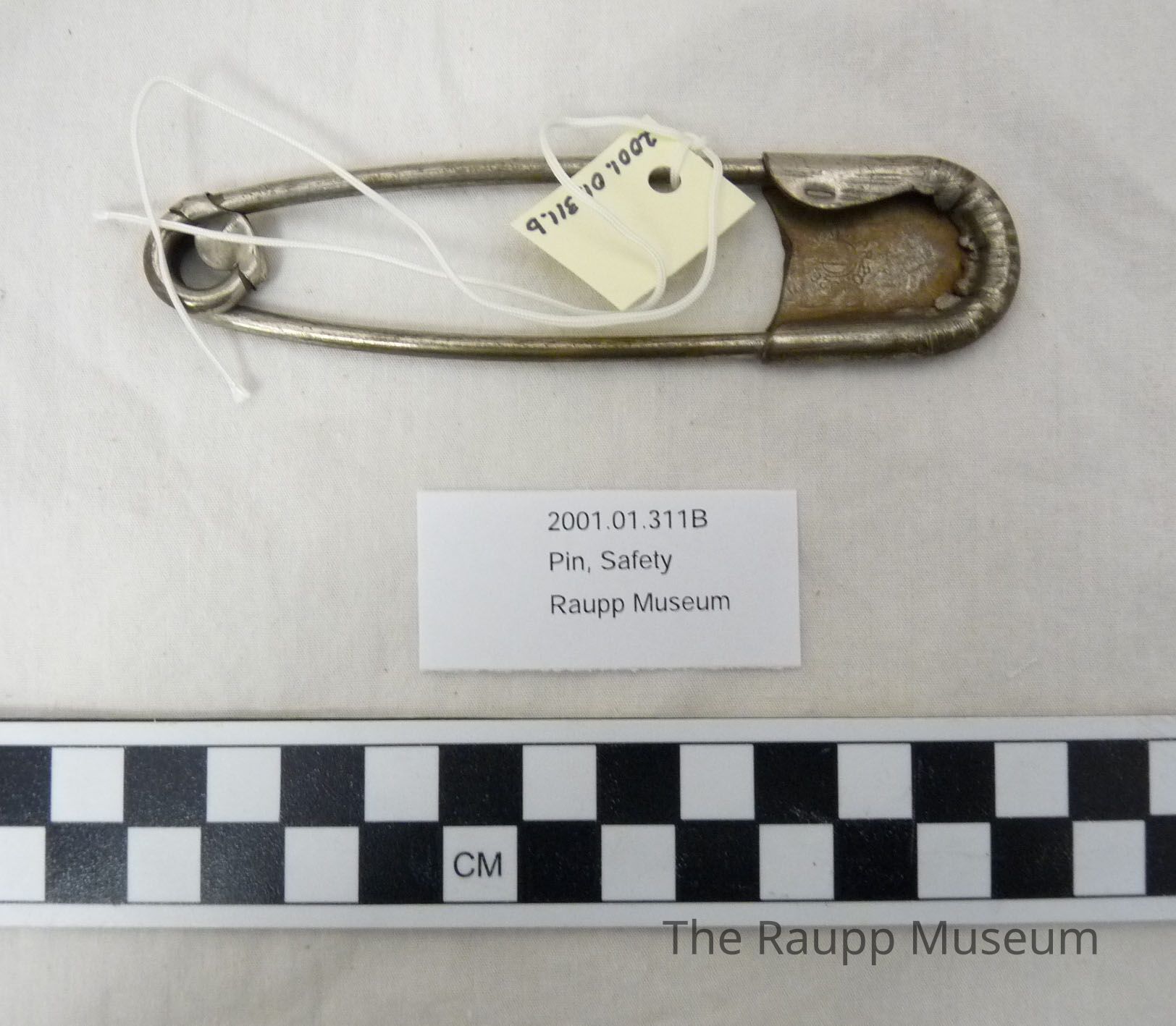 One (1) silver metal large safety-pin for laundry with number 216 on it. Museum original label: Laundry bag bins, 1910. Other marks include: "Pat. April 20, 1926"Dimensions