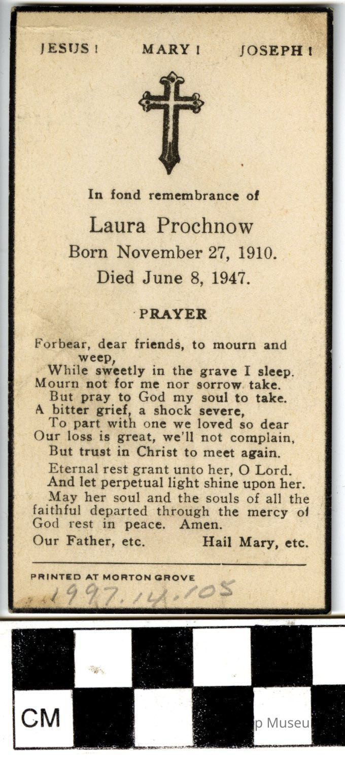 One (1) mourning prayer card for Laura Prochnow, born 11/27/1910, died 06/08/1947. On one side of the card is a prayer, and obituary in English with a cross. On the other side is a picture of the a monk holding a child, both have halos and there is a group of flowers in the right corner. There is a silver border around the picture.Archive Details