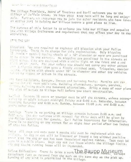 Photocopied original of the village laws and regulations. One legal size paper is folded in half to make a booklet. The cover has the early Buffalo Grove logo with a buffalo seal in the center with faded images of buildings around it. Faded text on all sides. Text includes: "Dear new Buffalo Grovians" welcome paragraph; the remainder of the document outlines various laws and regulations including: bikes, curfews, parking, pets, housing additions, trash removal, speed limits, swimming pools, vehicle stickers, weeds, watering/sprinkler use/ vacation information and voting.Archive Details