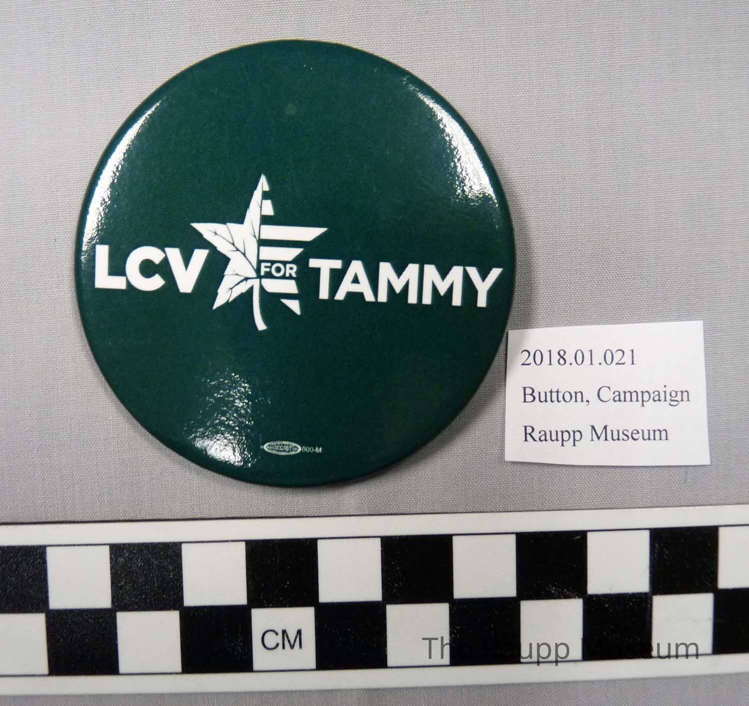 One (1) political button. The button has the text "LCV for Tammy" on one side, and silver metal with black and brown scratches on the back side. The button is white and green. There is a picture of a leaf on the front. There is a safety pin affixed to the back.Condition