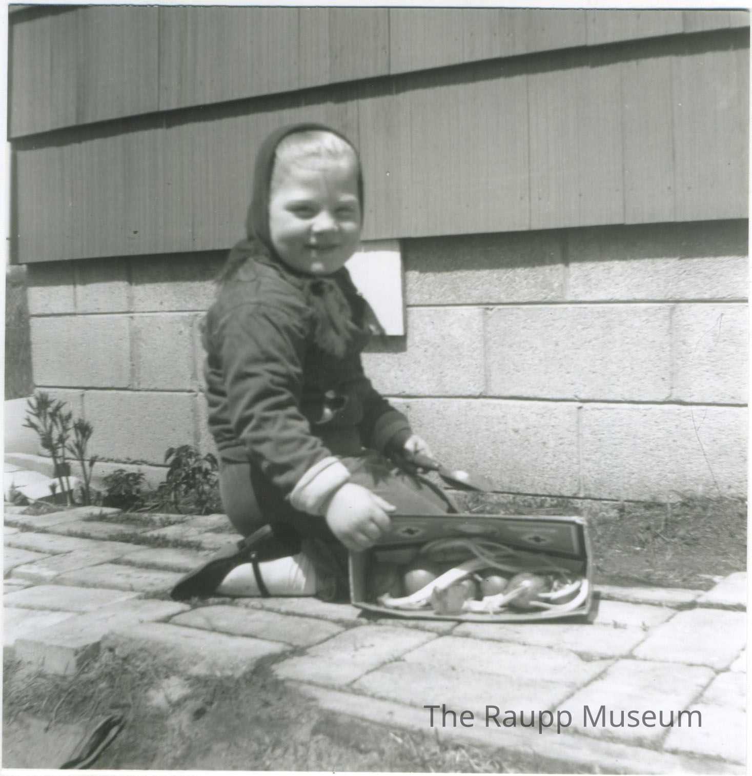 Glossy black and white print without border. Image of a young girl wearing a head scarf and black shoes with a strap. She is kneeling on a brick-paved walkway with a bag of green onions. Leandra Lorraine Weidner, oldest daughter of Ralph Lucian Weidner and Victoria Cecilia Marynowski. Photograph has an adhesive label on the reverse with a "1."Relationships