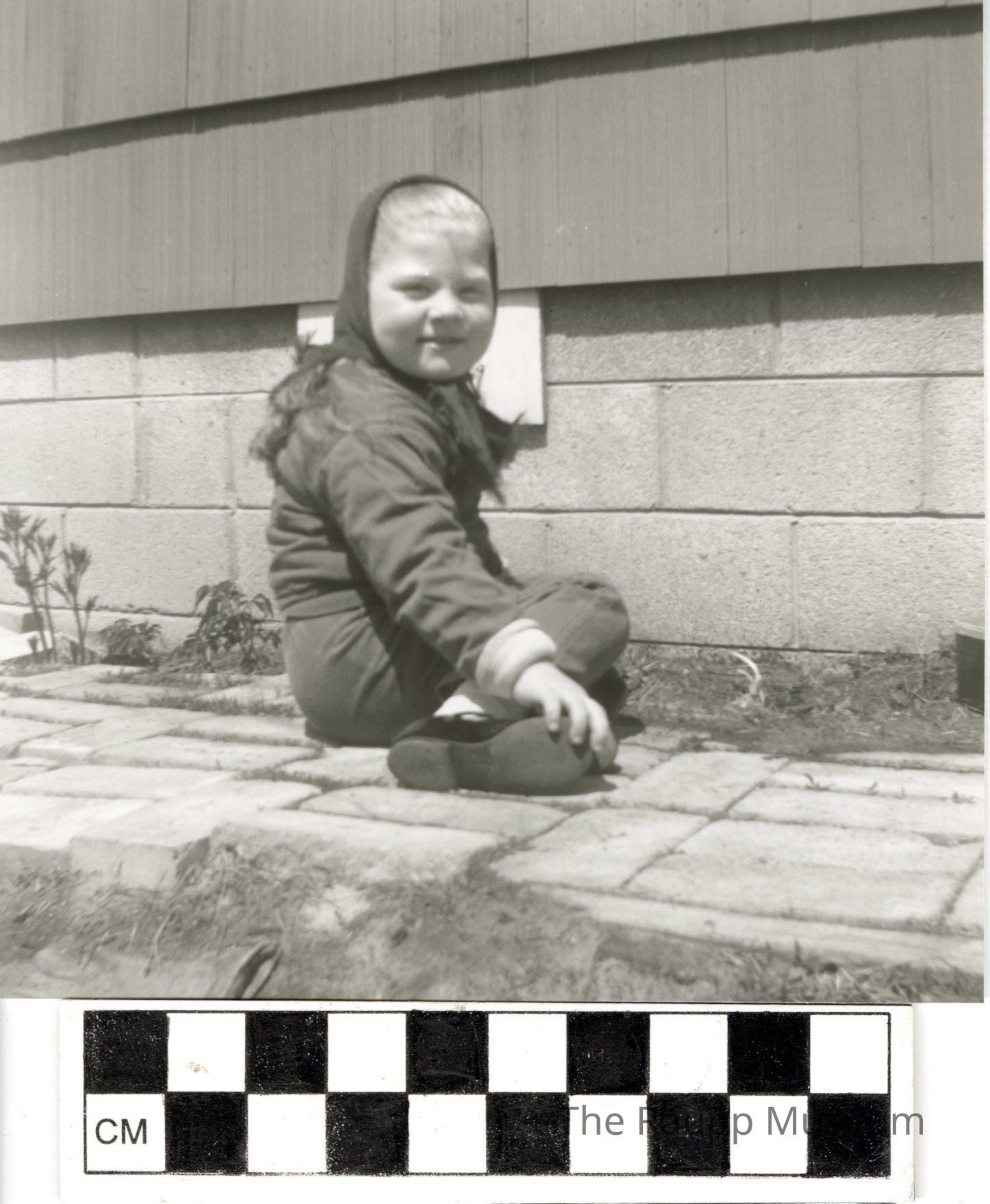 One (1) glossy black and white print without border. Image of a young girl sitting facing the an outdoor wall, with her head turned toward the camera. She is wearing a dark pants and shirt, with handkerchief tied around her head. She is seated on a tile walkway, with stone base and paneling on the wall. Photograph has an adhesive label on the reverse with a "4."