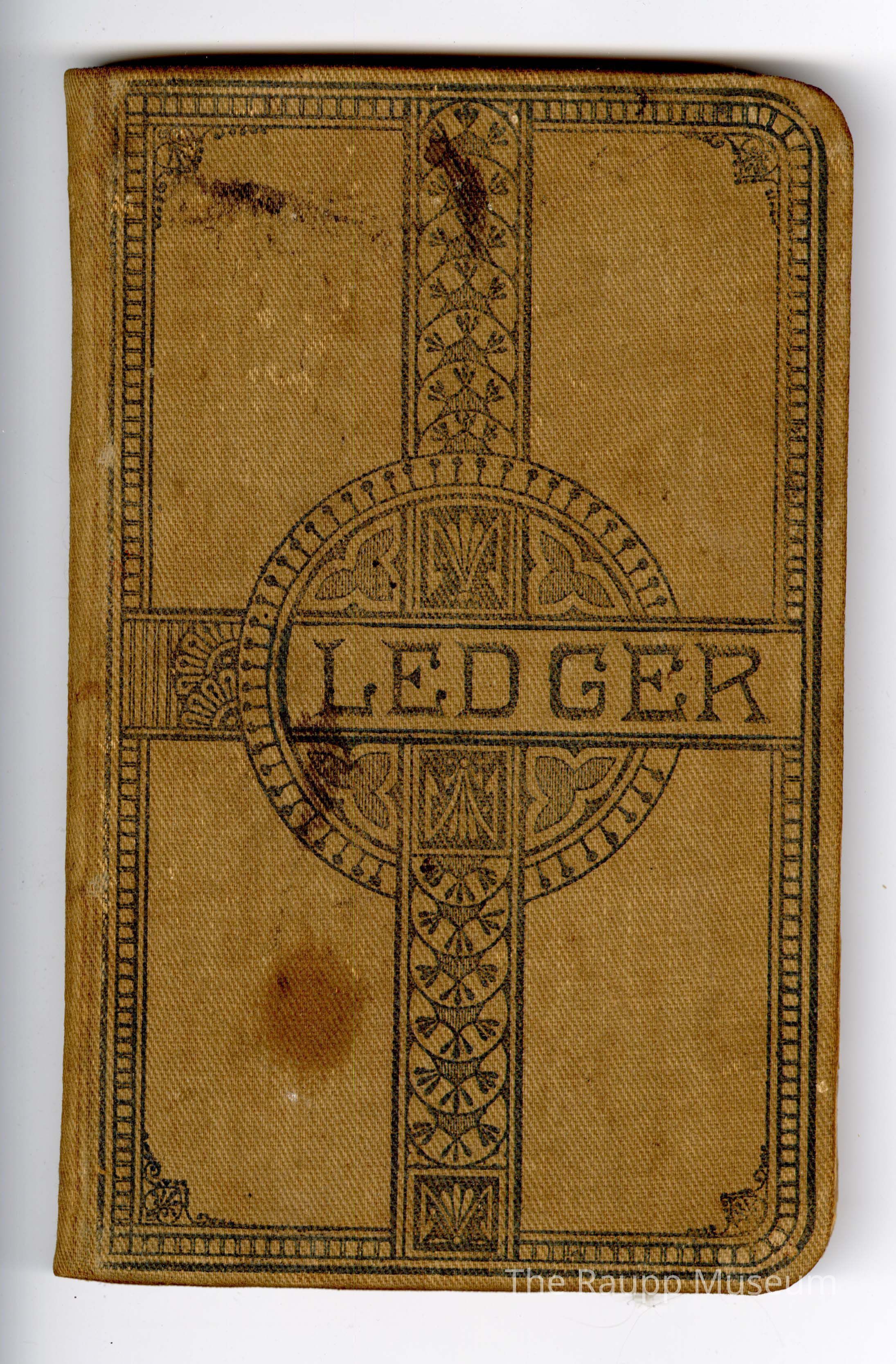 One (1) pocket-sized ledger belonging to John Simon Nickol from the 1890s to 1910s. Ledger has a cloth hardcover exterior, with the word "Ledger" in the center and decorative round border around the title. Decorative border extends to edges of ledger and is mirrored on the back. Inside are lined pages with handwritten records of accounts, farm bills, and goods sold. Handwritten records are in pen and pencil. Records range from 1897 to 1911.
