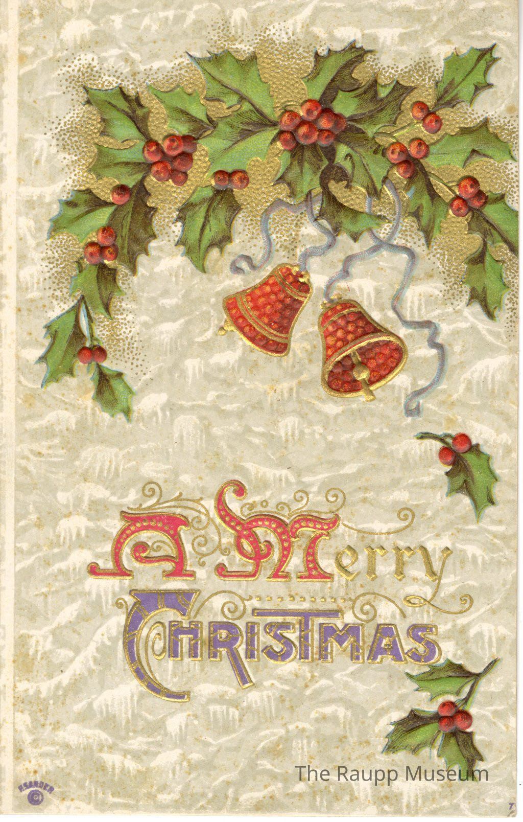 One (1) cardboard paper color Christmas postcard. Features an embossed holly and bells design, with "A Merry Christmas" embossed in the center.Archive Details