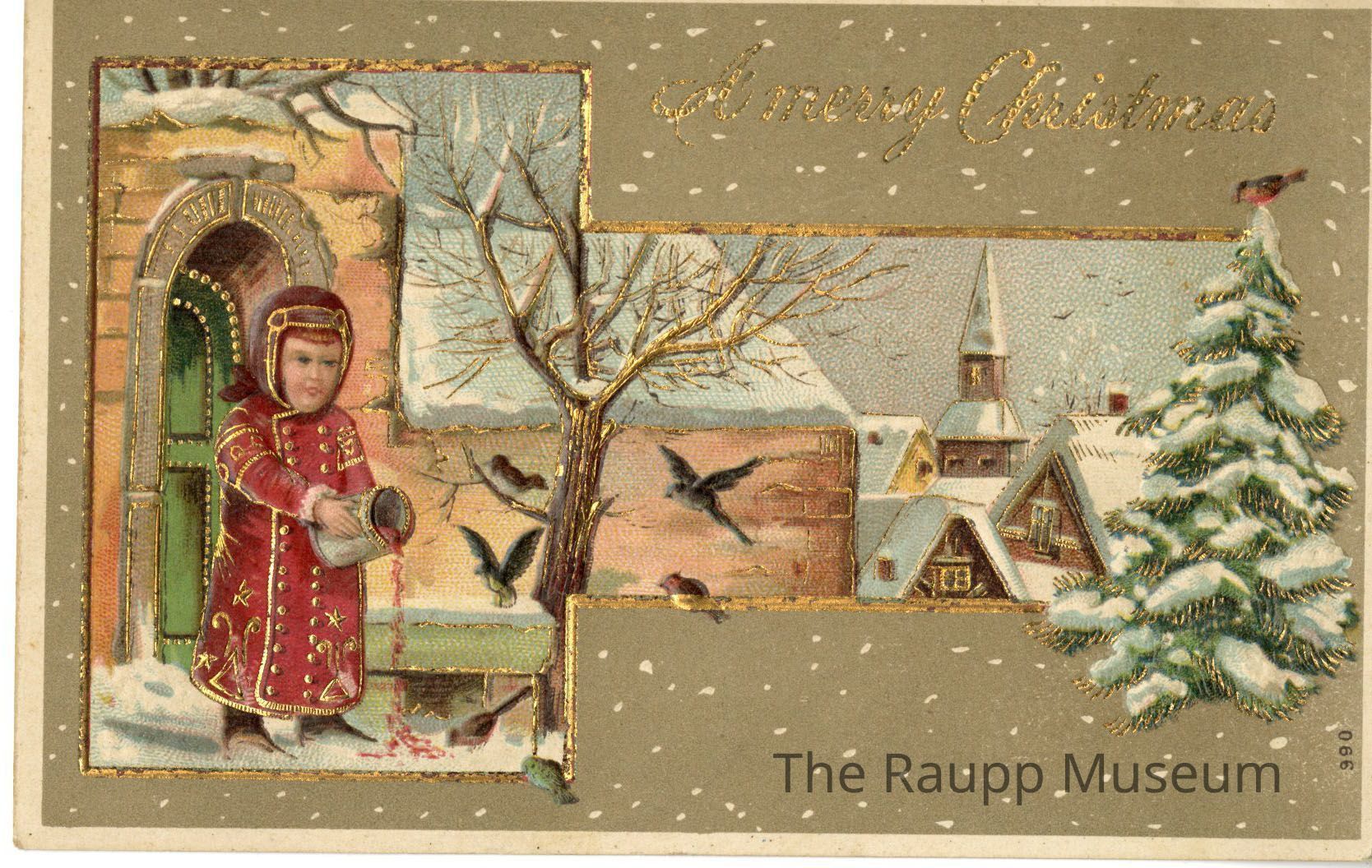 One (1) cardboard paper color Christmas postcard. Features an image of a girl dressed in red and gold dress with a bowl dripping red seeds for birds, and houses and a church behind her. Gold design along the borders and "A merry Christmas" message.Archive Details