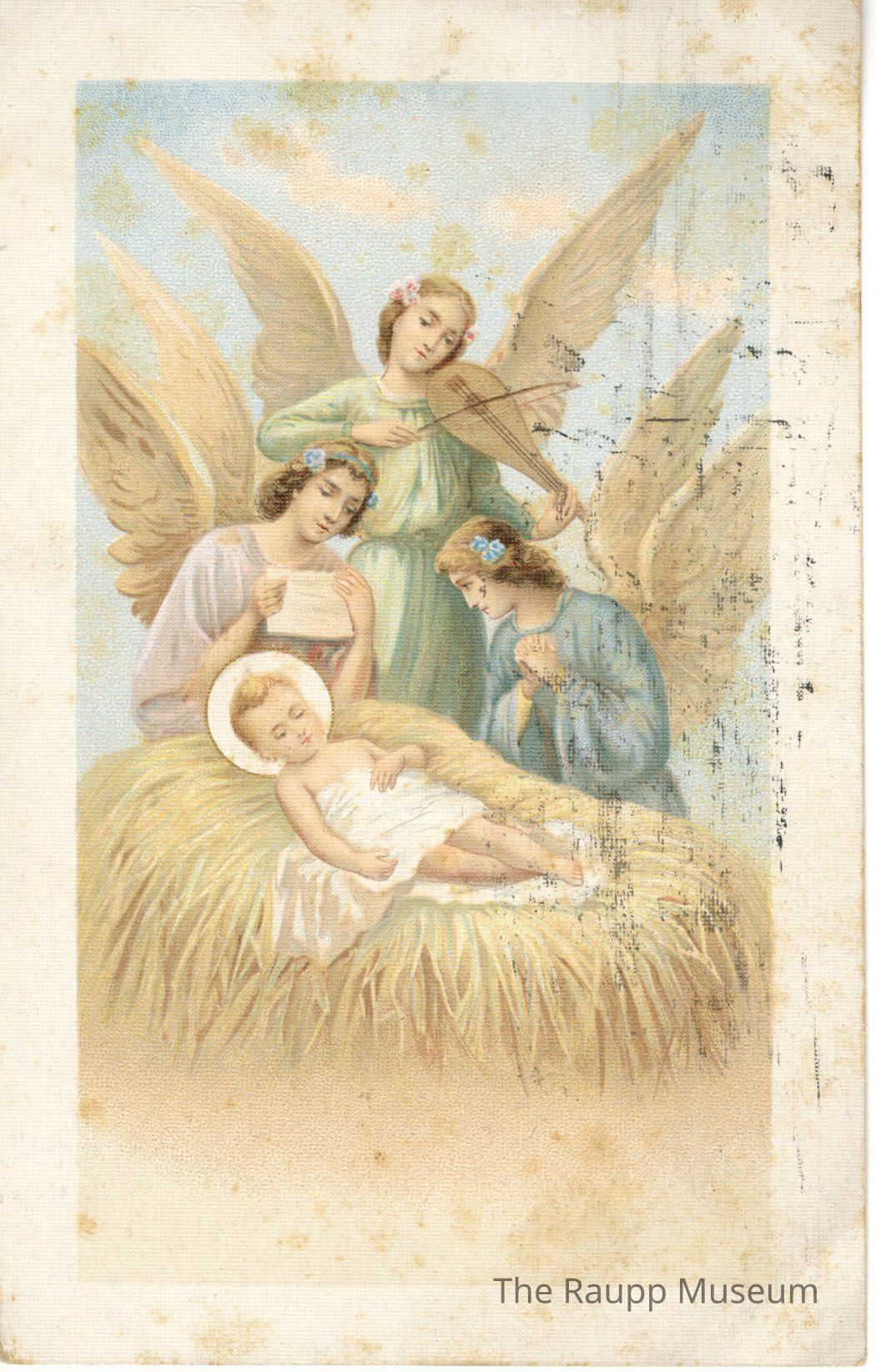 One (1) cardboard paper color Christmas postcard. Features three angels and baby Jesus. One angel is holding paper, one is playing a lute, and one is praying.Archive Details