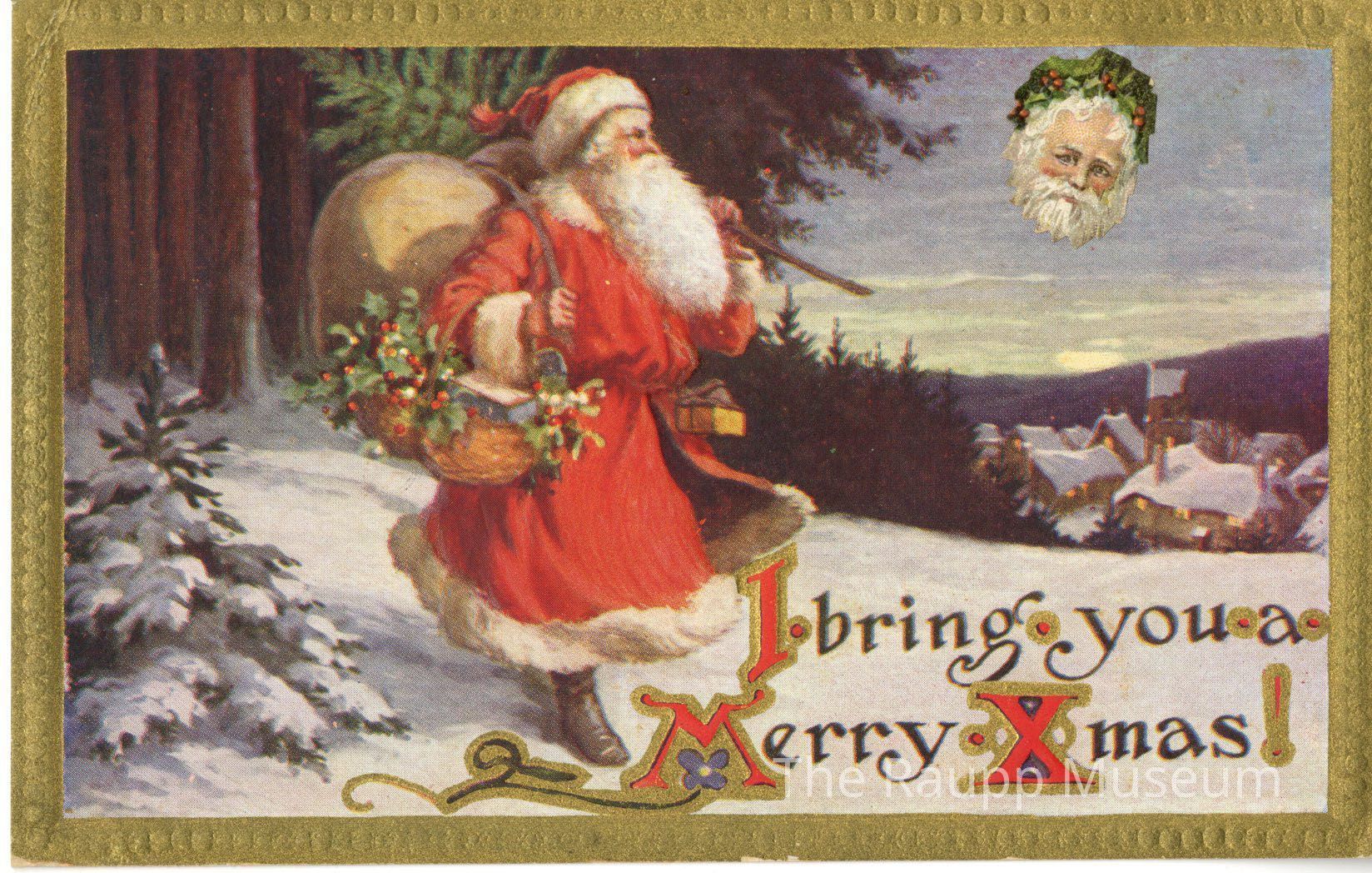 One (1) cardboard paper color Christmas postcard. Features a drawing of Santa Claus outside with a bag of toys and basket of holly. He is coming out of a forest, and behind him is a town.Archive Details