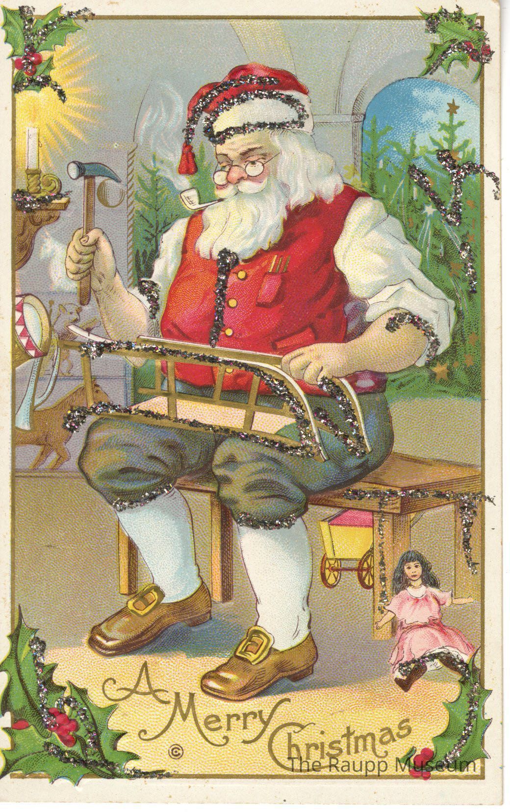 One (1) cardboard paper color Christmas postcard. Features a drawing of Santa Claus working on a sled on a bench, with toys and trees behind him. He is smoking a pipe. There is glitter glued all over the image. "A Merry Christmas" is printed on the bottArchive Details
