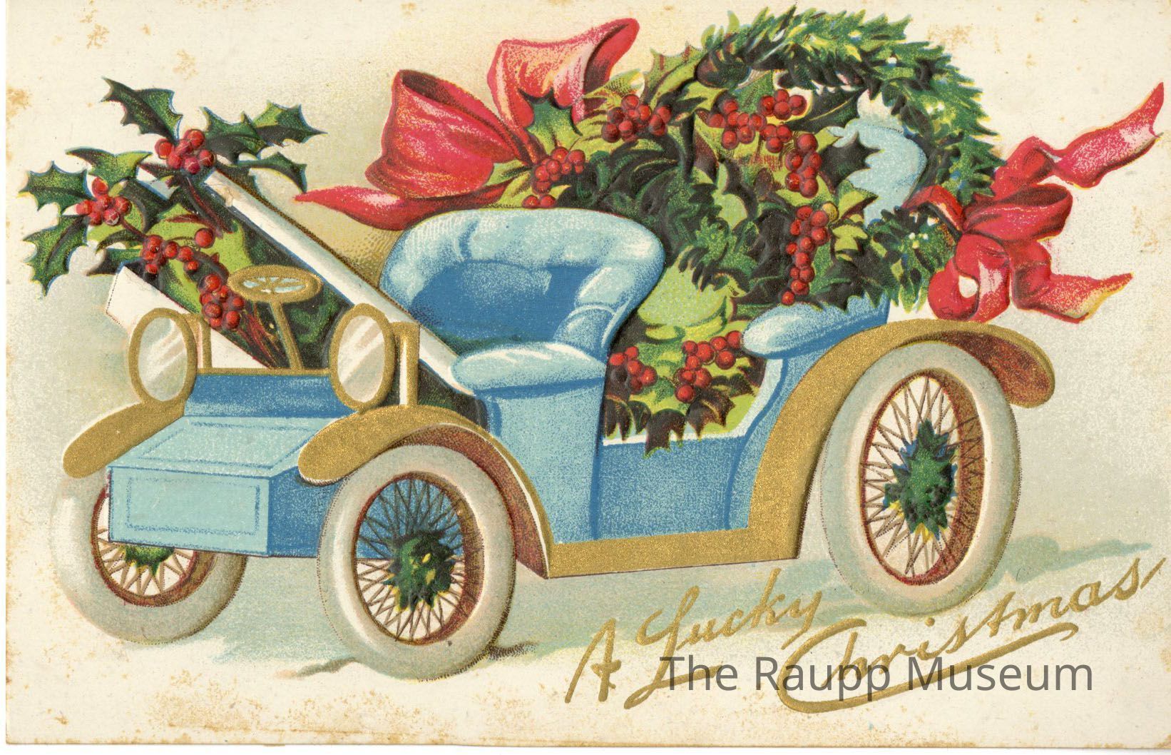 One (1) cardboard paper color Christmas postcard. Features a drawing of a blue car with holly and wreaths wrapped with red boys in it. "A Lucky Christmas" printed in gold on bottom.Archive Details