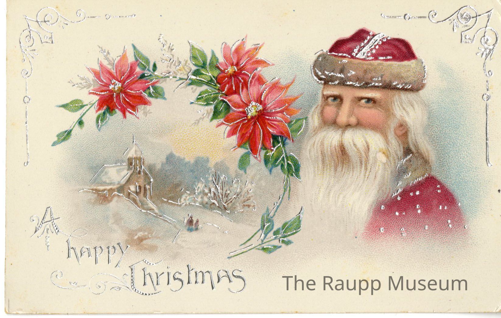 One (1) cardboard paper color Christmas postcard. Features a portrait drawing of Santa Claus from the shoulders up, and a scene of a church in the snow with red flowers around it. A silver border, and "A happy Christmas" printed on bottom.Archive Details