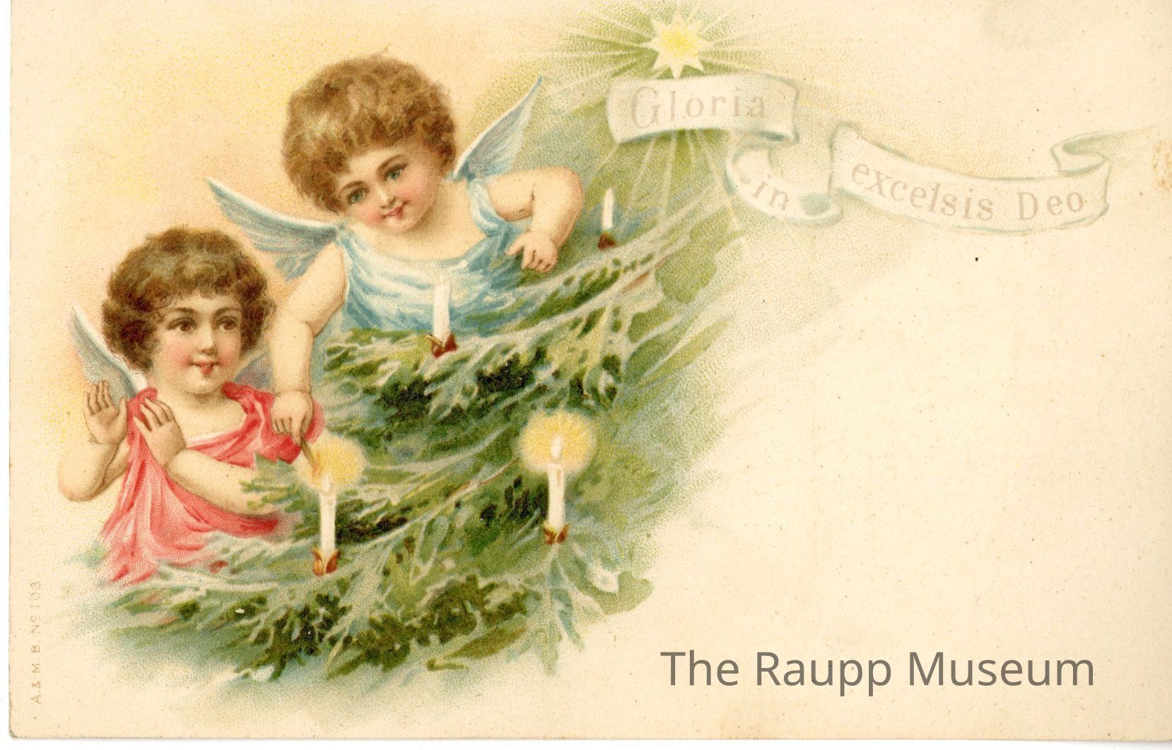 One (1) cardboard paper color postcard. The front has a drawing of two small angels (chibis), one in blue and one in red, lighting candles on a Christmas tree. One the side in a ribbon is printed "Gloria in excelsis Deo". On the back is handwritten "Master George Leikam".
