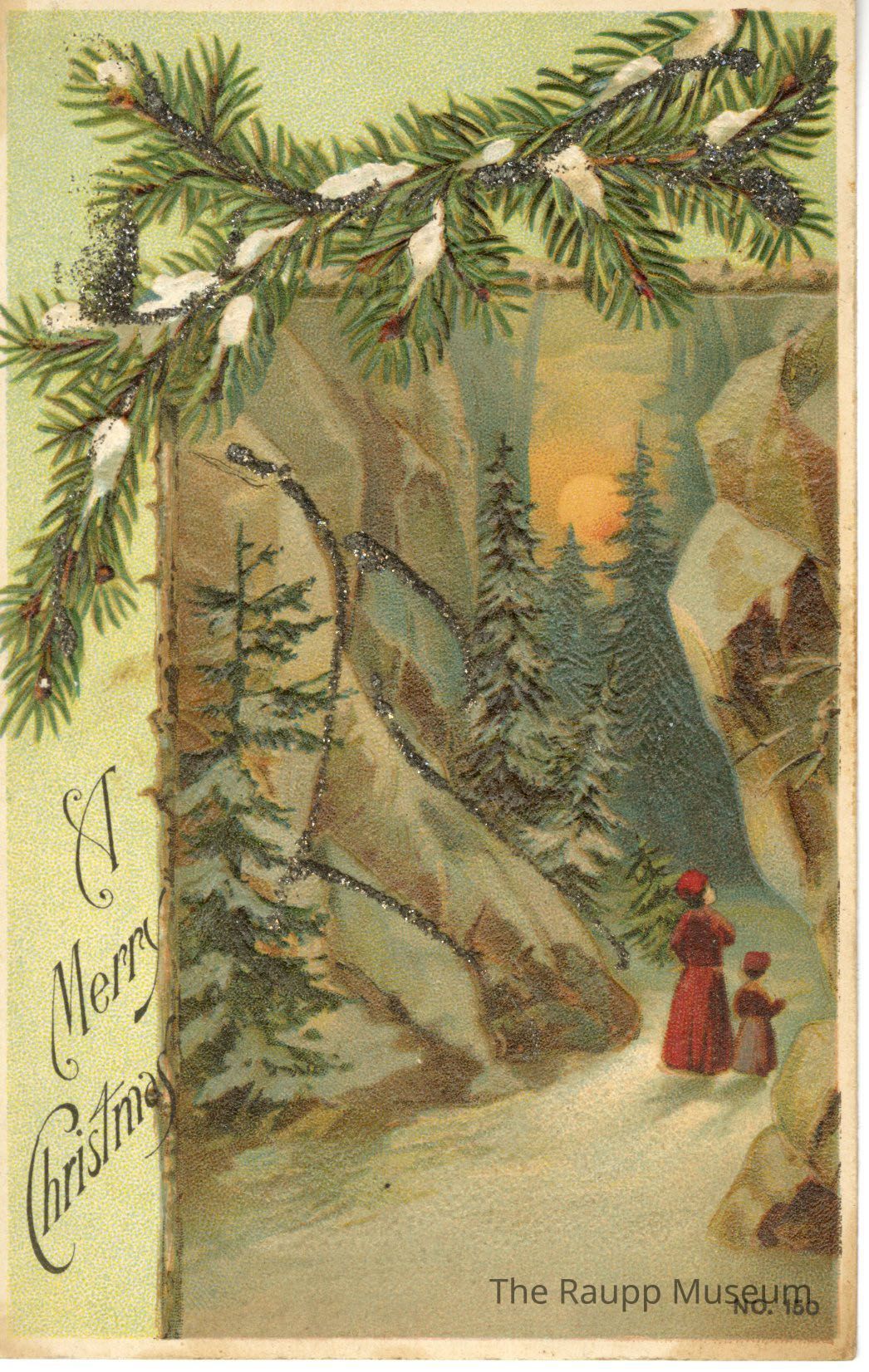 One (1) cardboard paper color Christmas postcard. Features a drawing of a woman and small girl, both in red coats, walking through a rocky pathway, with pine trees. "A Merry Christmas" is printed on the left, and "No. 150" on the bottom right.Archive Details