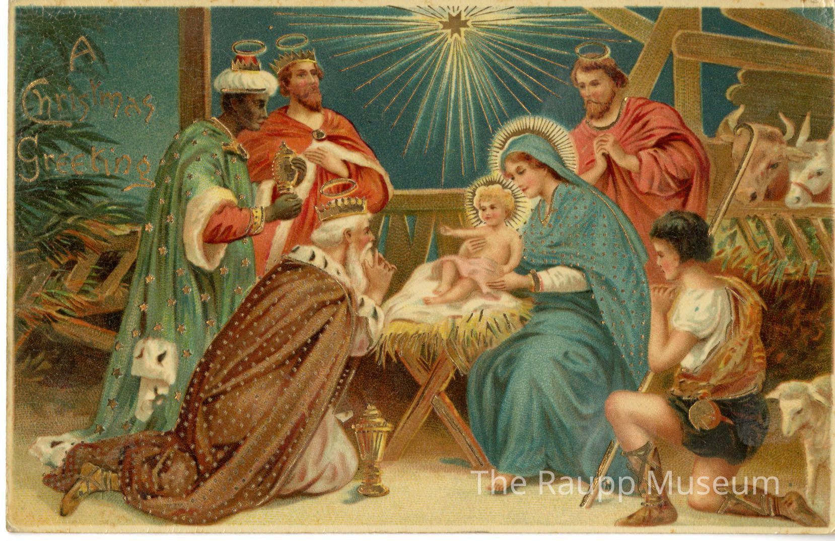 One (1) cardboard paper color Christmas postcard. Features a drawn nativity scene, with Jesus, Mary, Joseph, the Three Wise Men, and a shepherd. Printed in the left corner is "A Christmas Greeting".Archive Details