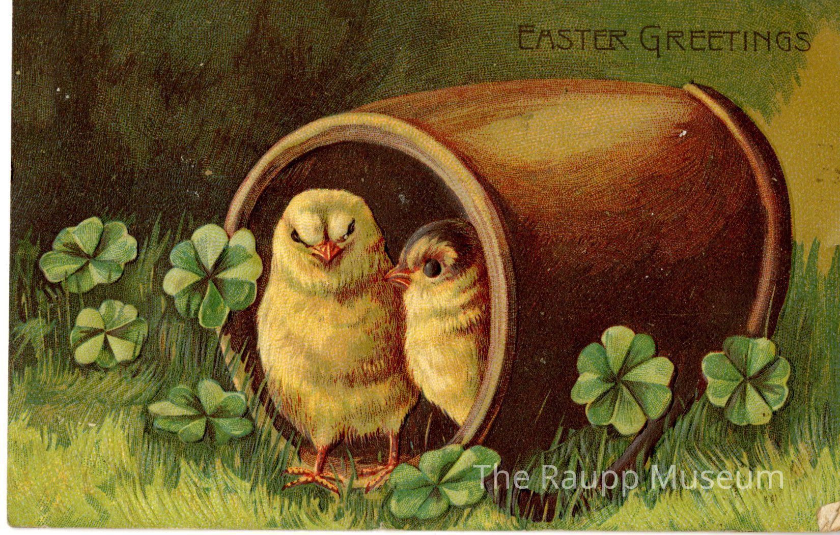 One (1) cardboard paper color postcard. Front features two embossed chicks in a brown container, toppled on its side in a grass and clover field. On the top right is printed "Easter Greetings". On the back is handwritten in ink "Mas. George Leikam Prairie View Lake Co. R. R. 3 Box 9, ILL" and "Best Regards to all from all, Mrs. Gladin".Archive Details