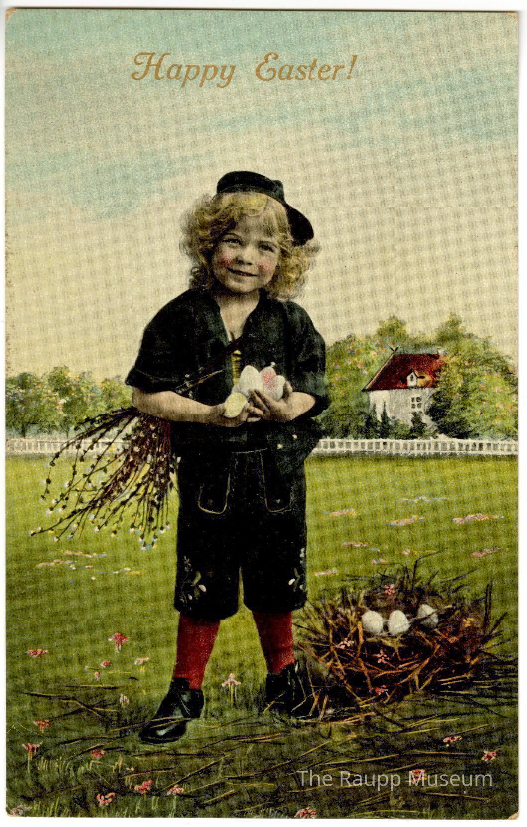 One (1) cardboard paper color postcard. The front has "Happy Easter" Printed on top with a picture/drawing of a young boy with blond hair, a blue vest and pants, and red stockings with black shoes. He is standing holding eggs and there is a nest with eggs to his left. He is also holding plants. There is a white house and white fence in the background. The back has handwritten "George L" and "Wishing you a Happy Easter and many East Eggs! From Grandma".Condition