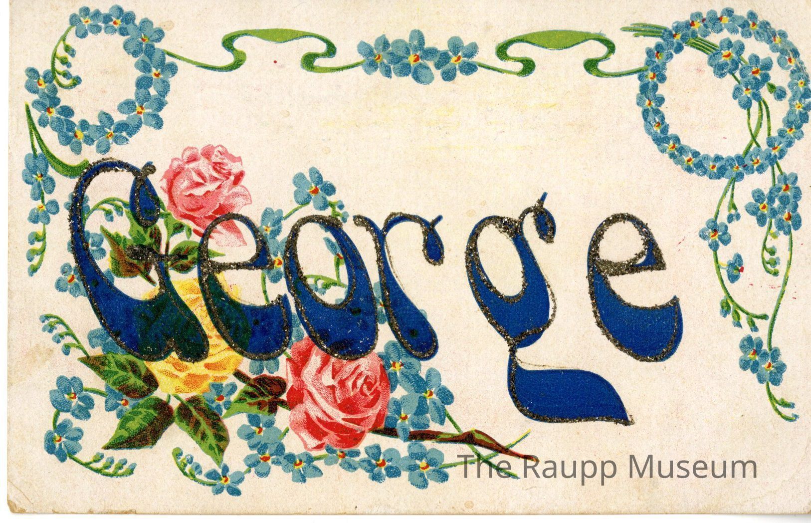 One (1) cardboard paper color postcard. The front features a blue and glitter handwritten "George" with blue flowers, two red roses and one yellow rose, and green leaves around it. One the top back is printed "Post card" in many languages, and "Printed in Germany" in the stamp. Handwritten on the left is "Kiss from Grandma" and on the right "Mas. George Leikam, Prairie View, Lake Co. R.F.D. No 3, Box 9, ILL".