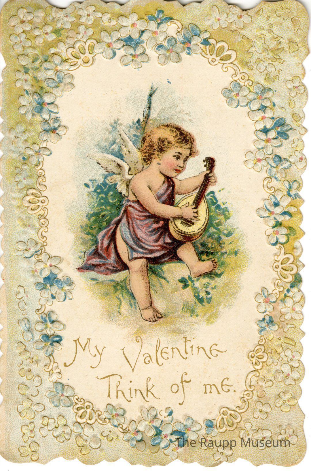 One (1) cardboard paper color postcard. The front has a drawing of a cherub in a red robe, with wings, playing a banjo, seated on a rock and leaves. Around the scene is an embossed border of blue and white flowers. On the back is printed "Fair is thy face to me As flowers in bonny May And therefore do I offer thee A true love gift to-day" and handwritten "George from Grandma".