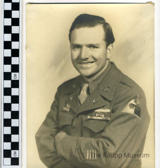 Black and white print with tan tones, matte finish and textured. Portrait image of Leonard Weidner wearing a military uniform. Uniform jacket has one three-ribbon bar and a single ribbon bar above. Uniform sleeve has patch with four horizontal stripes, a patch with one diagonal stripe, and a triangular shoulder patch insignia "6." Leonard has his arms crossed and is posed in front of a blank background.Dimensions