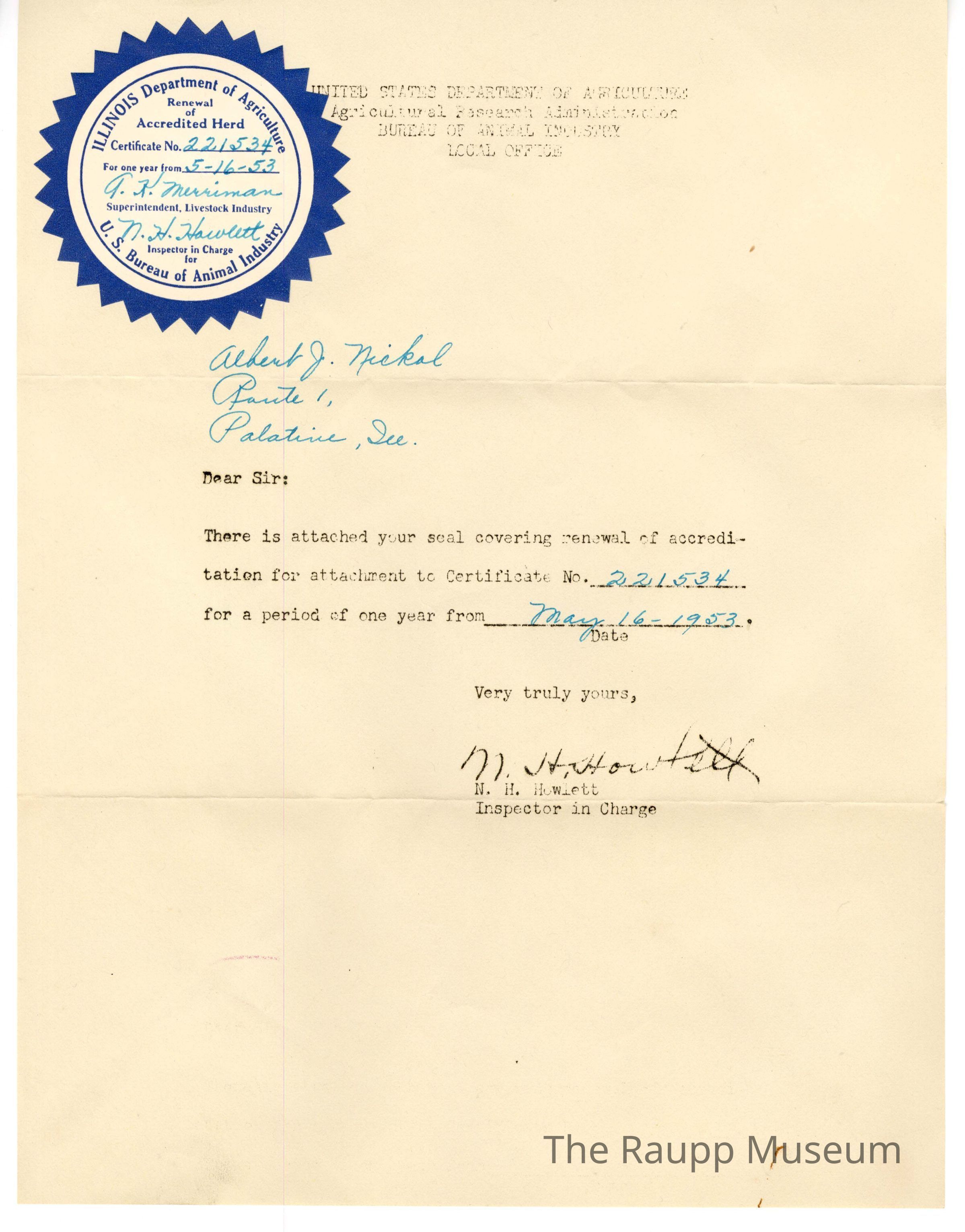 One (1) letter from the US Department of Agriculture Bureau of Animal Industry to Albert Nickol regarding their renewal for Tuberculin Free accredited herd certificate. Included is a seal in the top left corner, blue and white, for certificate no. 221534 for year from 5-16-1952 to 5-16-1953. Letter is one sentence and is signed by the Inspector in Charge, N.H. Howlett.
