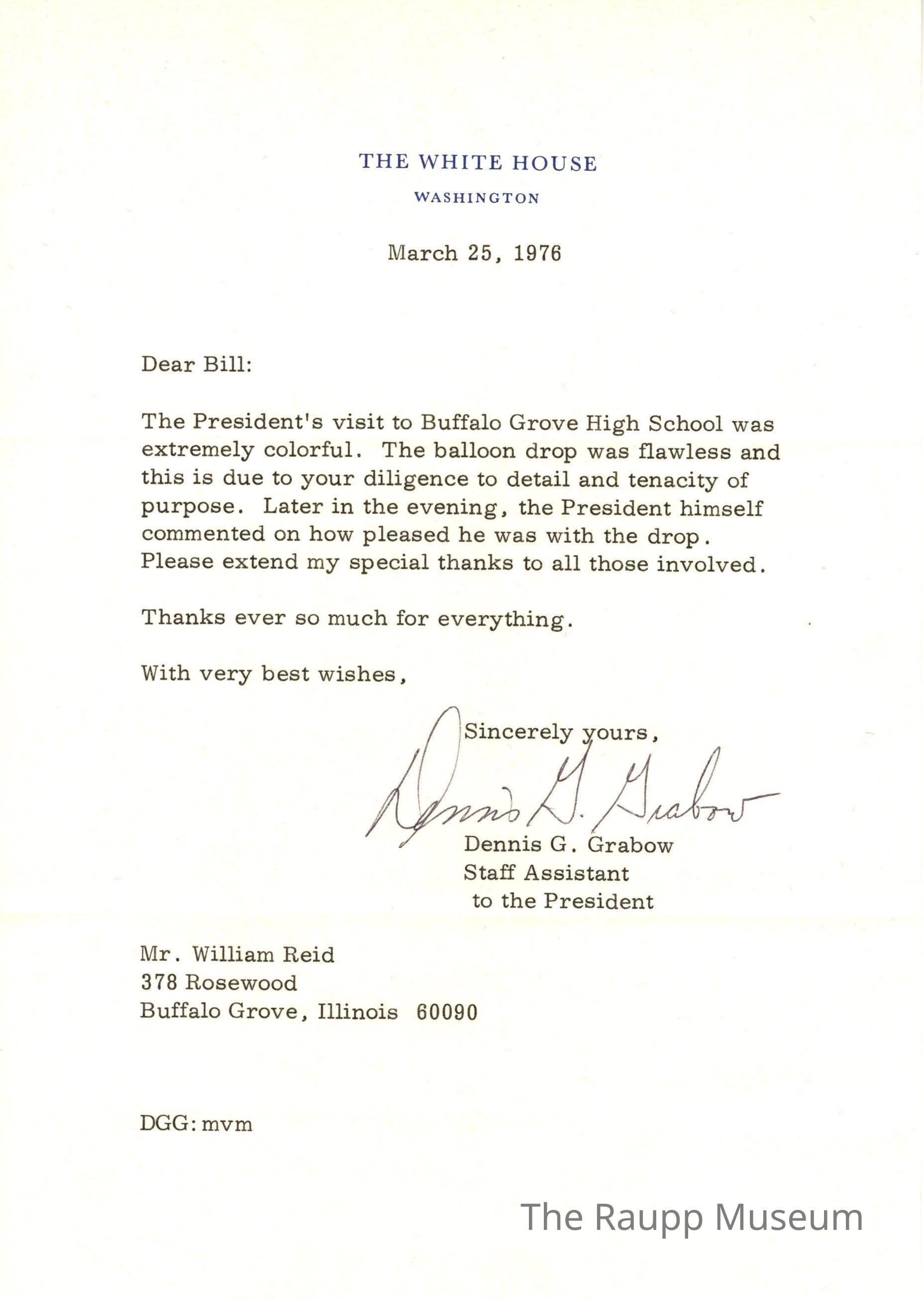 One (1) letter on White House letterhead to Mr. William Reid from Dennis G. Grabow, Staff Assistant to the President. A thank you note regarding President Gerald R. Ford's visit to Buffalo Grove High School. The letter compliments the balloon drop. Letter is typed with an hand-signed ink signature.Archive Details