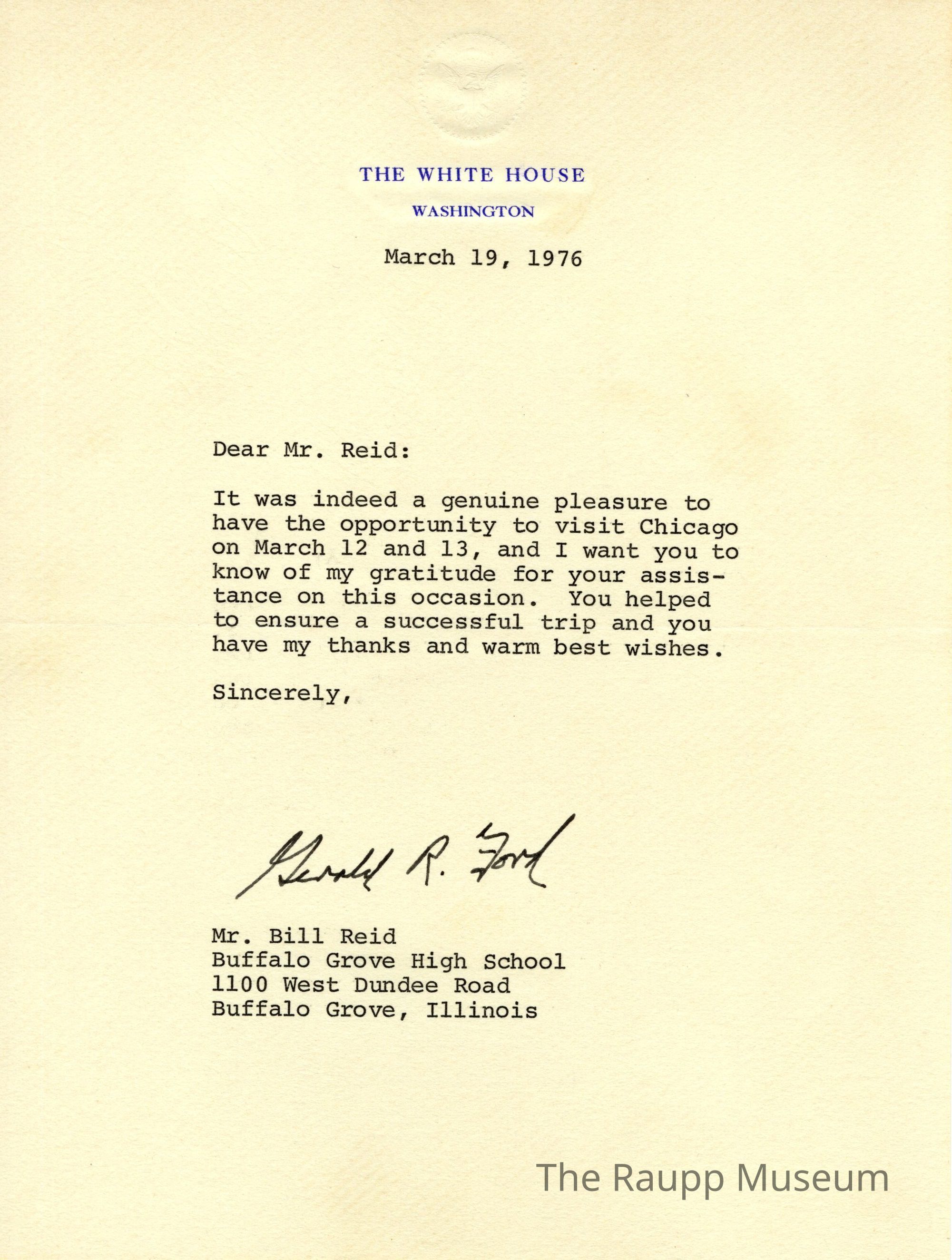 One (1) letter on White House letterhead to Mr. William Reid from Gerald R. Ford. A thank you note regarding President Gerald R. Ford's visit to Buffalo Grove High School. William Reid is addressed as Bill. Embossed Presidential Seal and the embossed "The White House Washington" at top center. Letter is typed with a hand-signed, black ink signature.Archive Details