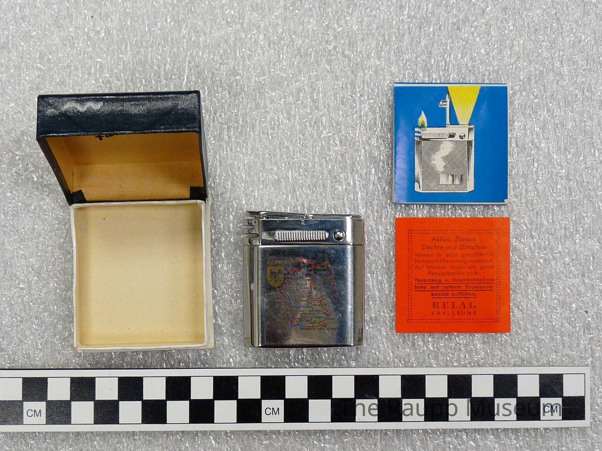 One (1) metal lighter and its cardboard box. The lighter has a map of Germany on one side, and is a rectangle shape. The lighter with compartment for fluid and slide igniter, flashlight has battery inside and side button. Box has hinged bottom and lid. Lid is dark blue with "Fuma Lux" on top, and white cardboard bottom. There is also an instruction pamphlet enclosed in multiple languages and another piece of red paper in German.Dimensions