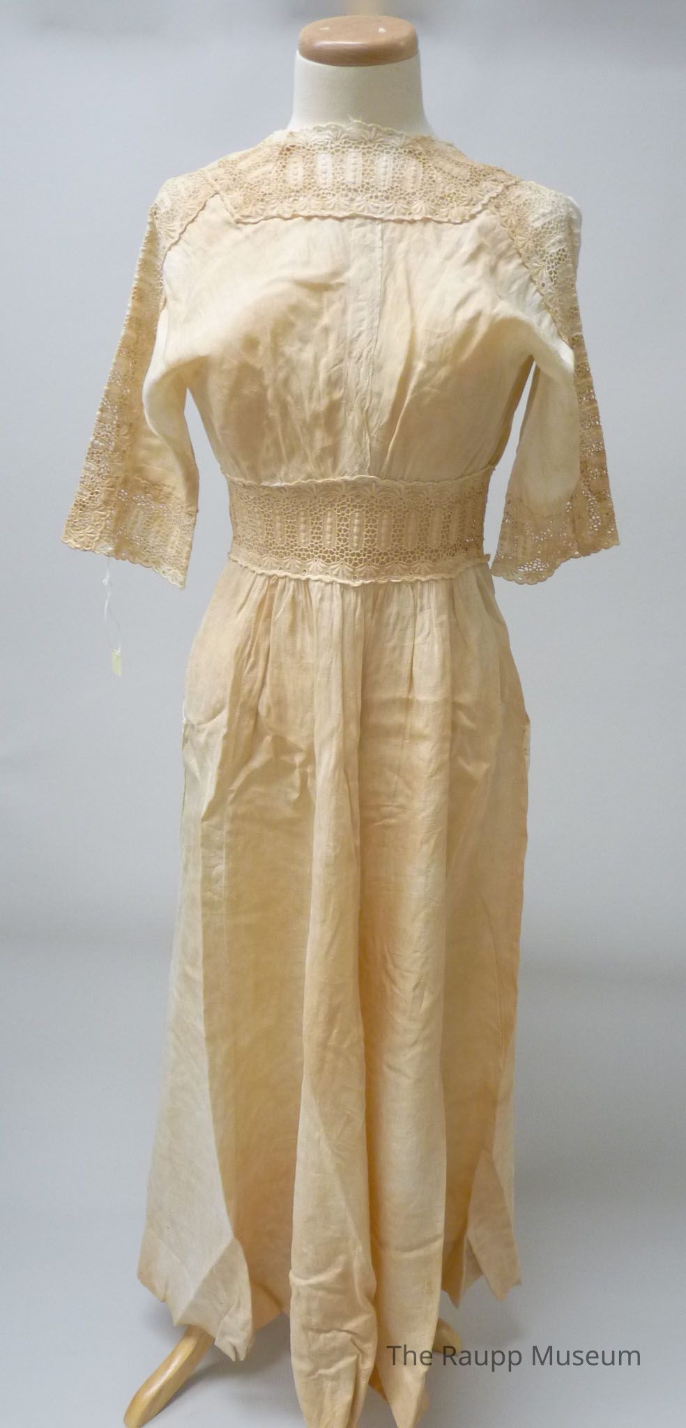 One (1) ecru linen dress. Lightweight linen dress has eyelet and open work lace trim at neck, shoulders, cuffs, waist and front center. Two patch pockets below waist.