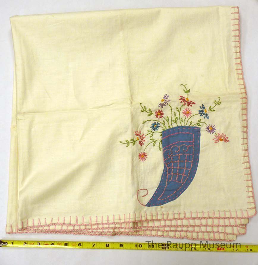 Square white linen table cloth. With pink embroidered perimeter and multi-colored floral embroidery in each corner peaking out of blue cornucopia-shaped pockets. Associated with group of four matching napkins.Dimensions