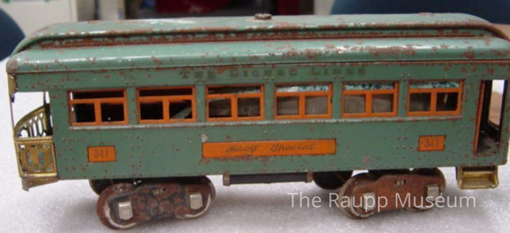 Metal toy train passenger car caboose painted green with orange and gold trim. Two sets of wheels. Plastic film inside the car's windows. Each end of the car has one swinging door to access interior. "341 Macy Special" painted on sides.Made/Created