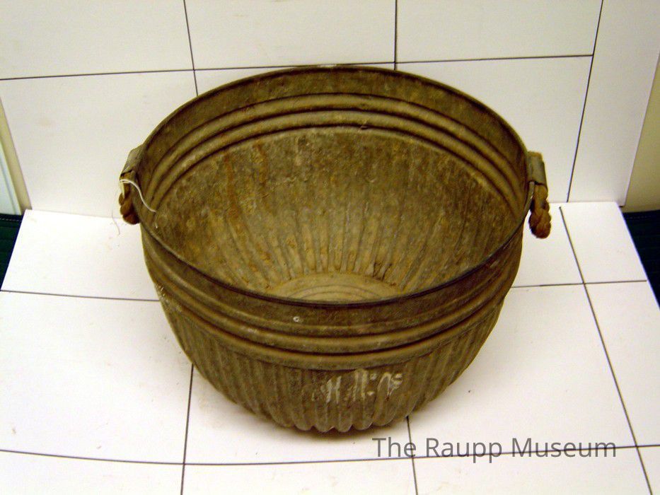 One (1) brown and grey metal feeder. Galvanized metal container with pleated sides, double-sheet bottom, riveted together, rolled rim, attached rope handles on sides. Molded on side inside diamond is "Hall, Trademark".