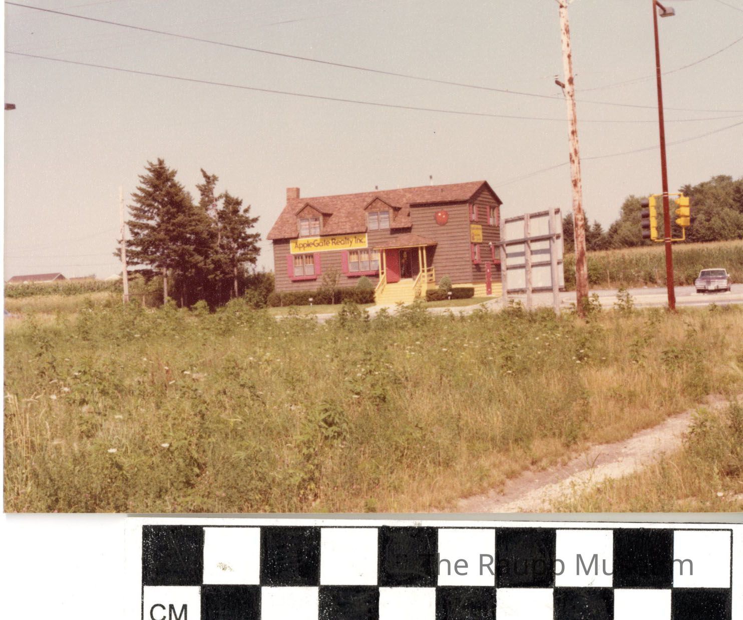 One (1) color photograph of Long Grove School, McHenry Road. The photo is taken from a field in front of the school. The building in a two-story rectangle, with brown siding and red trim. There is a yellow porch on the right. A sign "AppleGate Realty Inc." There is a car in the parking lot to the right of the school, and a large grey sign, and a traffic light.