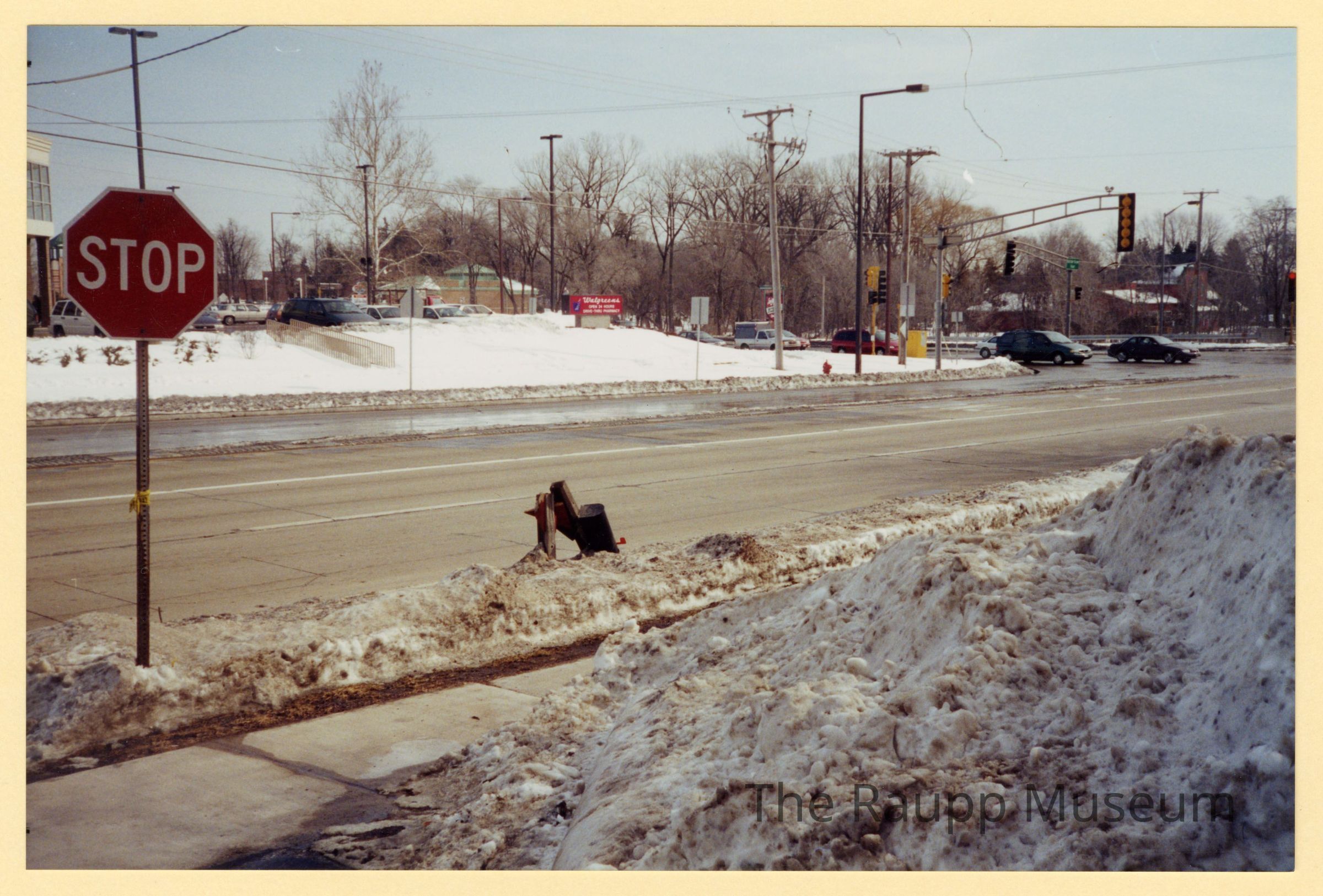 One (1) color photograph of Buffalo Grove Road, looking South East. In the foreground is a broken mailbox, and stop sign. Across the street Walgreens sign and parking lot is visible. There is lots of snow on the side of the road.