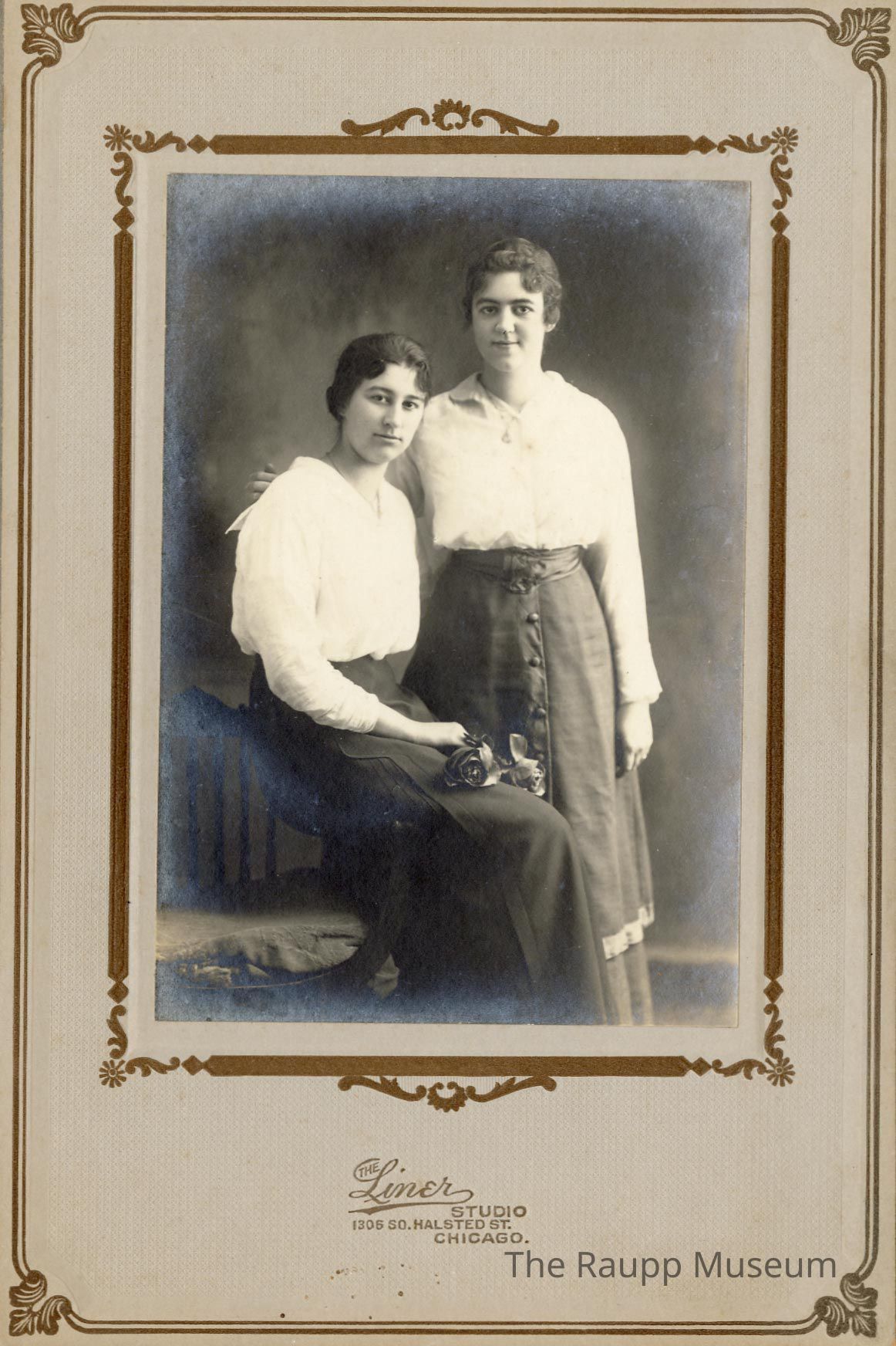 One (1) black and white portrait photograph. Image of two women, Lorina and Nelda Weidner (daughters of William Weidner and Mary Schmit), one seated on a chair arm and one standing to her left. Both women are wearing black skirts with white blouses. The standing women has a white fringe near the bottom of her shirt and bottoms down the front. Both women have dark hair and pulled their hair back.Dimensions