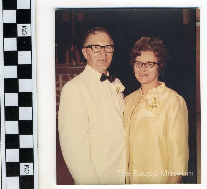 Matte color print. Image of Joseph Brehm and Louise Weidner standing together at their son, Ken's Wedding. Joseph is wearing a white dinner jacket, black bow tie and white carnation boutonnière and wearing Eisenhower style glasses. Louise is wearing a yellow dress with a matching yellow jacket with elbow length sleeves. She is also wearing a boutonniere and glasses. Image printed on Kodak paper. reverse side has pencil inscription in upper left corner: "B14."Relationships