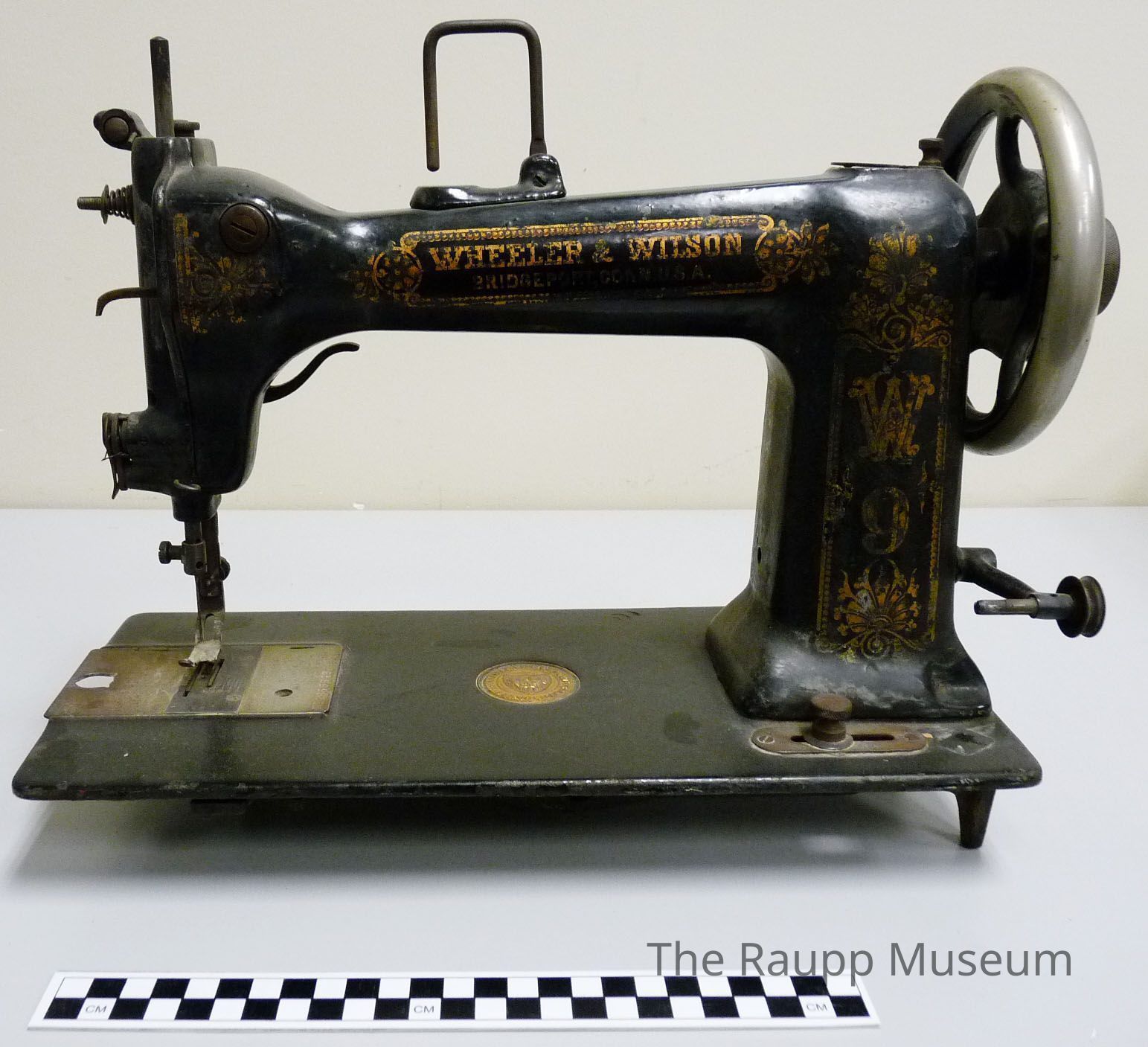 Hand crank sewing machine with gold toned embellishment and black enameled casing. Manufactured by Wheeler and Wilson, D-9 model. Serial no: 2665848. Iron base has three iron feet, inset twist knob panel and sliding, silver tone sewing plate engraved with patent information and serial number. Gold embossed medallion inset into center of the base with manufacturer's logo. Metal bobbin inserted under the sewing plate.Dimensions