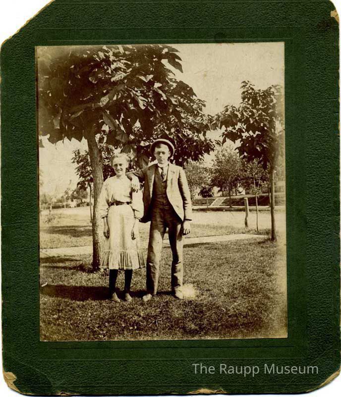 Sepia colored print mounted on a heavy gray textured cardstock. Image of a man and a woman standing in front of some trees. The woman stands to the left of a man with his arm resting on her shoulder. She wears a light color blouse tucked into a skirt with a ruffle near the hem and dark tights. He wears a three-piece suit, a hat, and glasses.