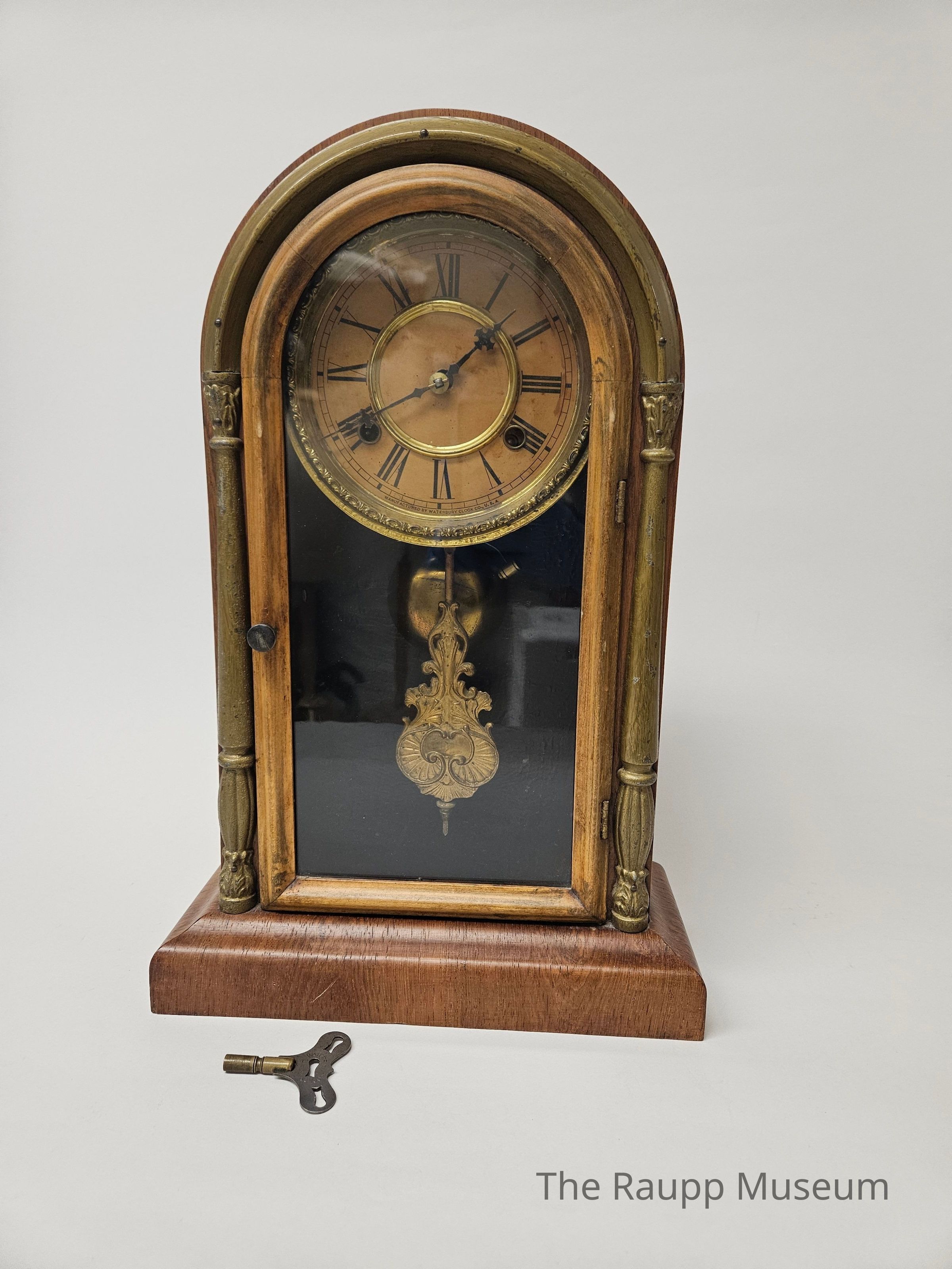 One (1) mantel clock. Clock has a rounded top and square bottom, with a glass cover. Clock is made of wood and glass, with metal parts on the inside. There is a wooden frame, with wooden embossed columns painted gold on the front edges. There is a handle on the left side, to open the glass door. There is a large gold decorative pendulum hanging from the clock face. The clock face it circular, with a gold metal border, and paper front. On the bottom of the clock face is printed "Manufactured by Waterbury Clock Co., U.S.A". On the back there are printed instructions on how to wind the clock, set the alarm, and set the clock. The back inside is painted black. The pendulum has a twisted knob to adjust the swinging speed.