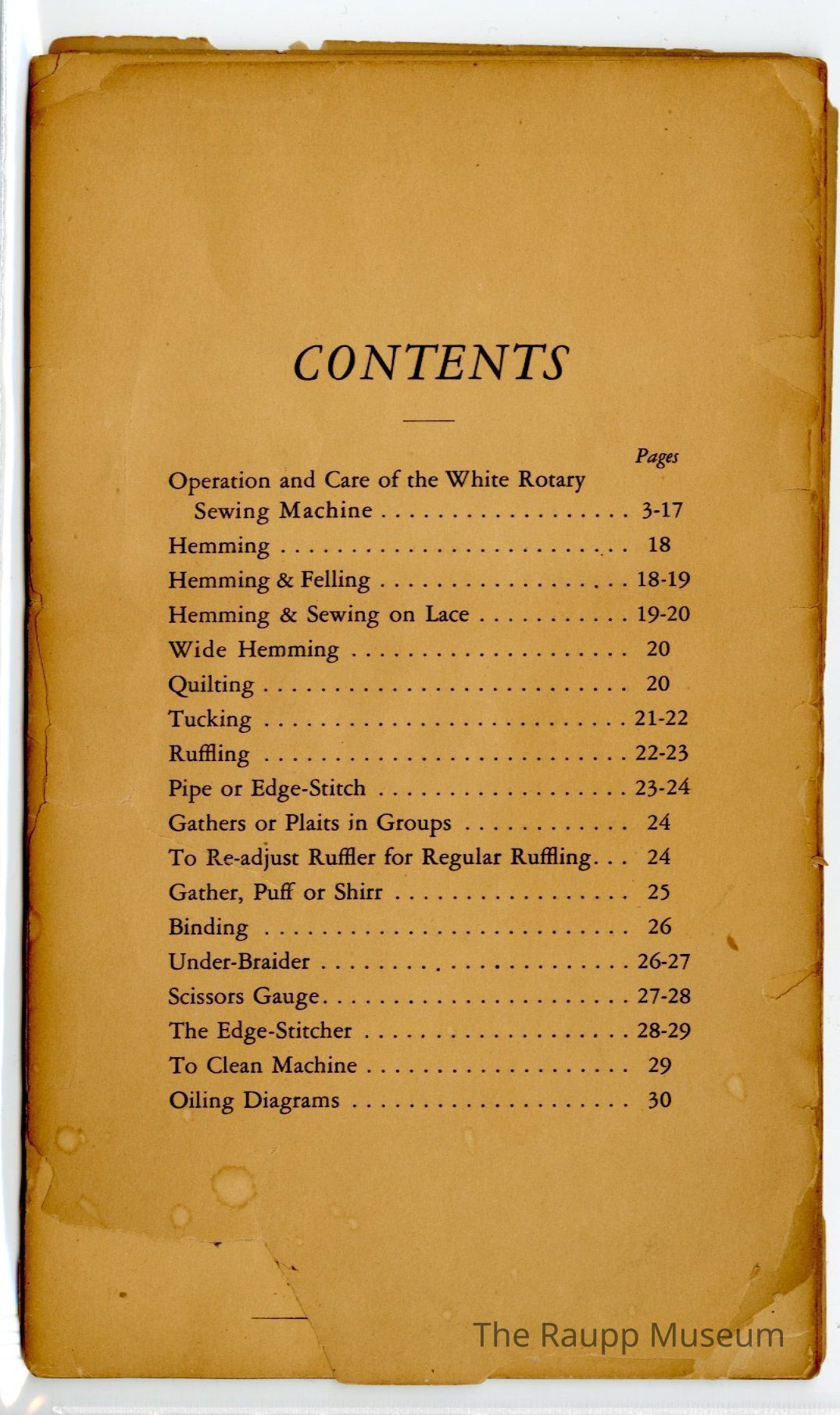 One (1) 30 page manual for the White Rotary Sewing Machine. Found in door of sewing machine case (2022.01.007). Removed to archives for safer preservation.