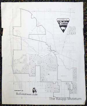 Single-sided black and white street map of Buffalo Grove showing land parcels. Red pencil outlined parcel in the center. Triangular village of Buffalo Grove logo in the upper right corner and "Compliments of Ballantrae" logo in the lower left corner. One of three identical maps.Map Details