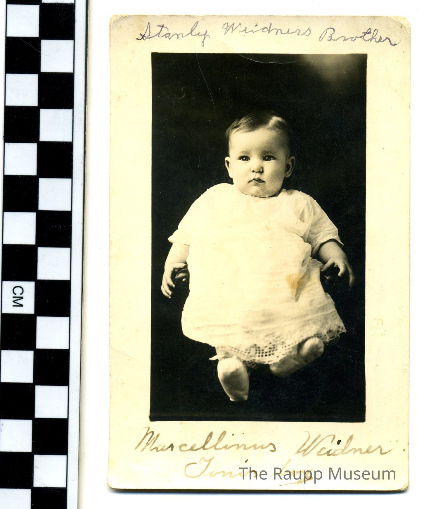 Black and white image with white border and postcard back. Image of a Marcellinus Weidner as a baby seated in a small chair and wearing a white dress with square perforated hem. Dark studio backdrop. Handwritten text across upper edge: "Stanley Weidner's brother;" text on lower edge: "Marcellinus Weidner; Toni's boy."