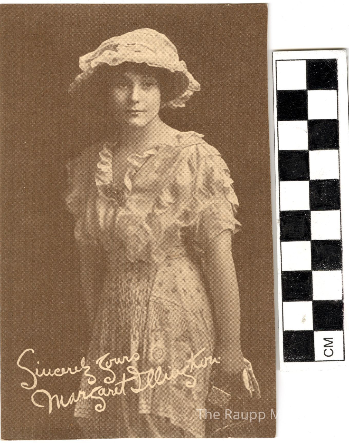 One (1) beige, black and white postcard. The front has a sepia-toned photo of Margaret Illington, with a message printed in white cursive: "Sincerely yours, Margaret Illington.". The women is wearing a white dress with short-sleeved ruffled V-neck top, and a patterned skirt. There is a white hat, and she is holding white gloves and a purse.
