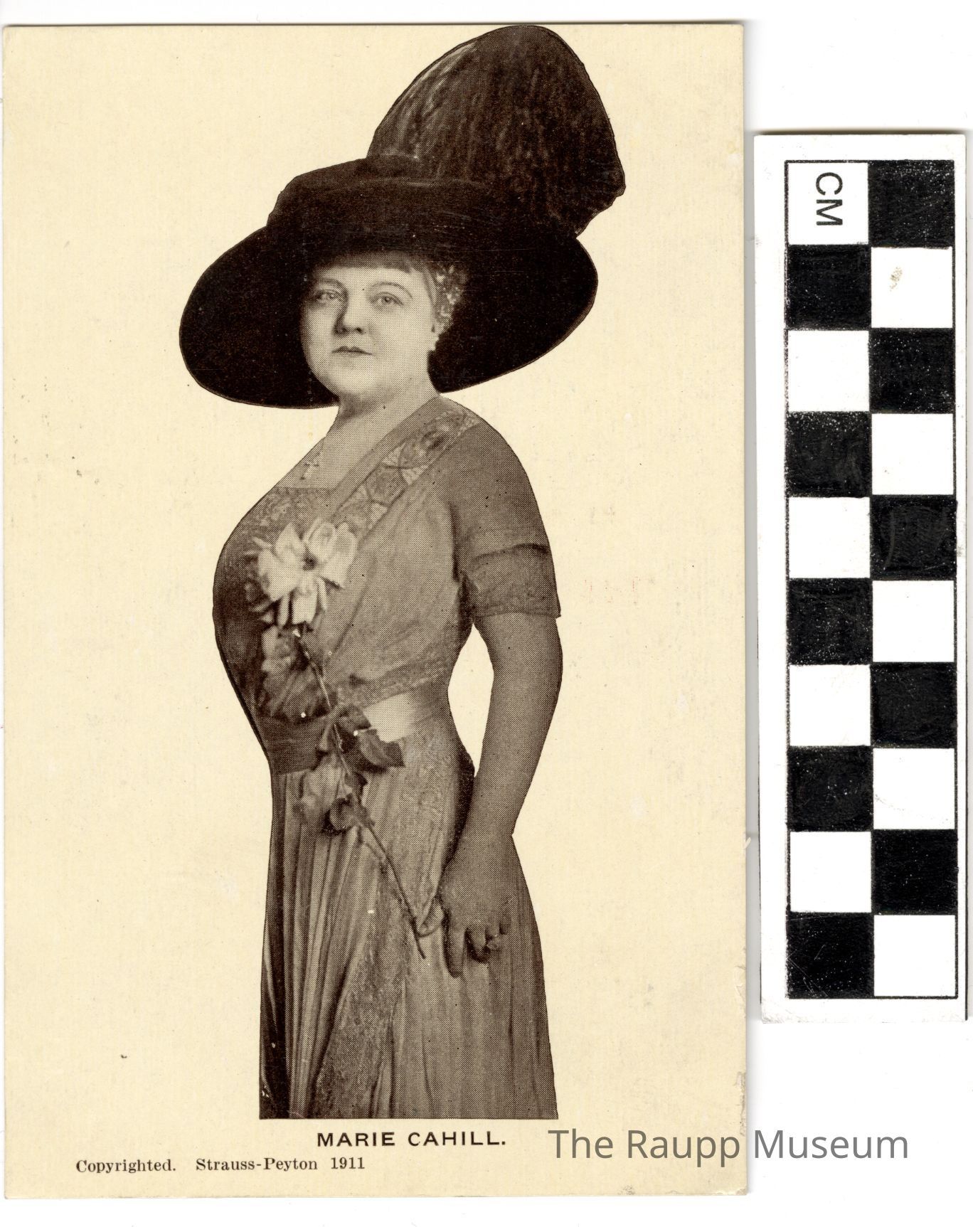 One (1) beige, black and white postcard. On the front is a black and white photo of a women with a large hat and fitted dress with geometric designs on the front. She is facing the side with her head turned over her left shoulder towards the camera. Under the photo is printed: "Marie Cahill. Copyrighted. Strauss-Peyton 1911".