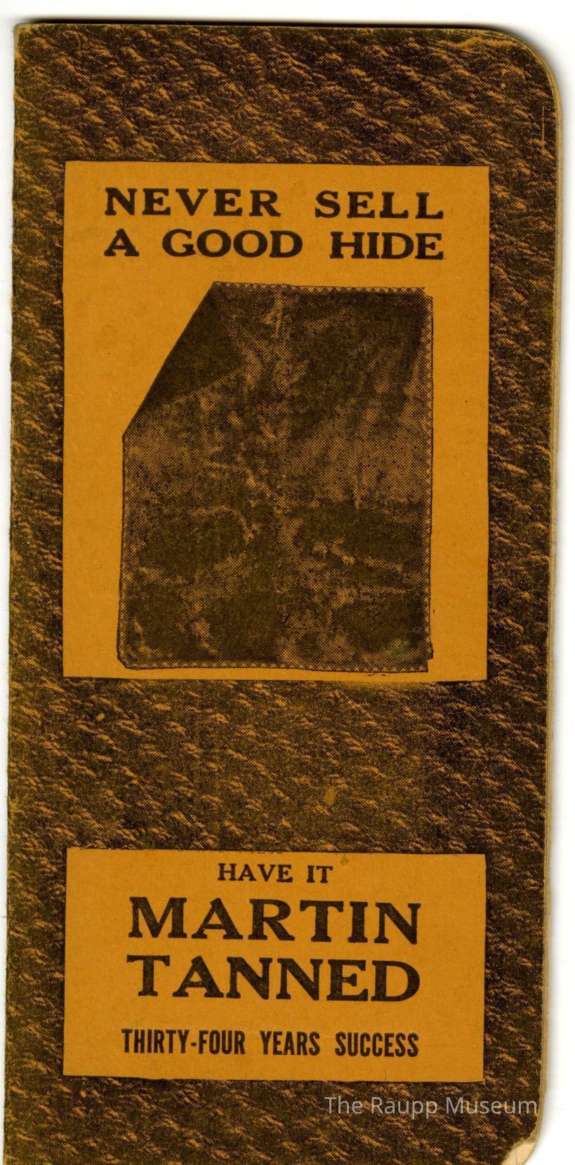 One (1) notebook with graph paper on the inside. The cover is cardboard with brown and orange background, printed "Never Sell A Good Hide, Have It Martin Tanned, Thirty-four years success". The back has another add for Martin furs, with a stamp for "Geo. M. Weidner, Prairie View, ILL RFD Aptakisic.". Inside cover is handwritten "Marie Raupp" and there are letters written on the graph paper throughout.
