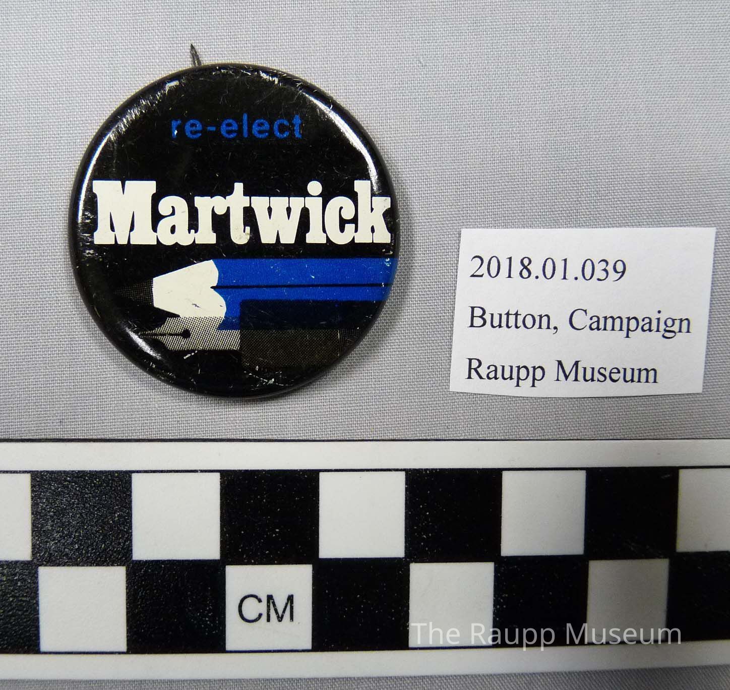 One (1) political button. The button has the text "re-elect Martwick" on one side, and silver metal on the back side. The button is white, black, and blue. There is a metal pin affixed to the back.